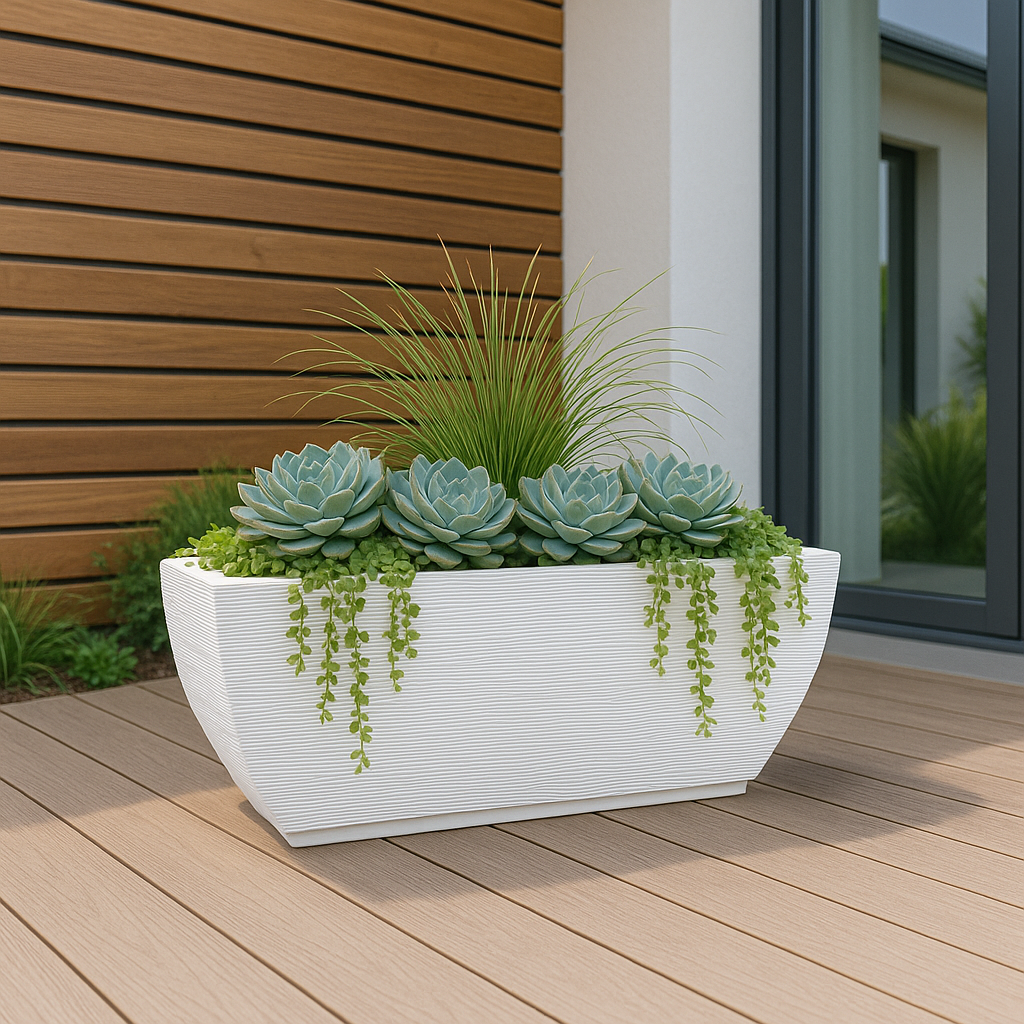 Aporta armonía y calidez a tu casa o jardín con la línea de macetas Ámsterdam Graphito de Floridis. Práctica y resistente, este macetero rectangular de 95x27 cm. en color blanco es perfecto para tus plantas de interior o exterior.
