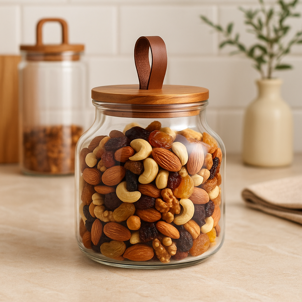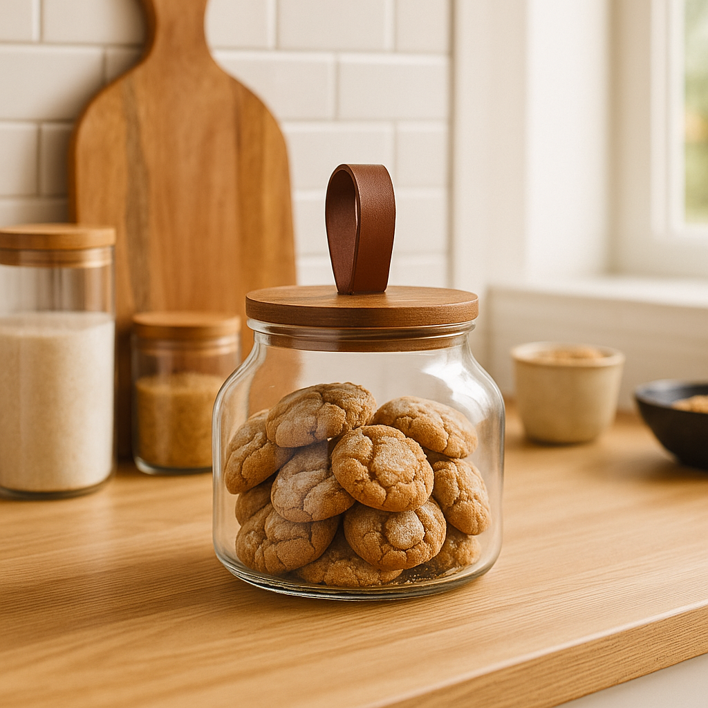 RECIPIENTE VIDRIO 3L TAPA MADERA Y CUERO