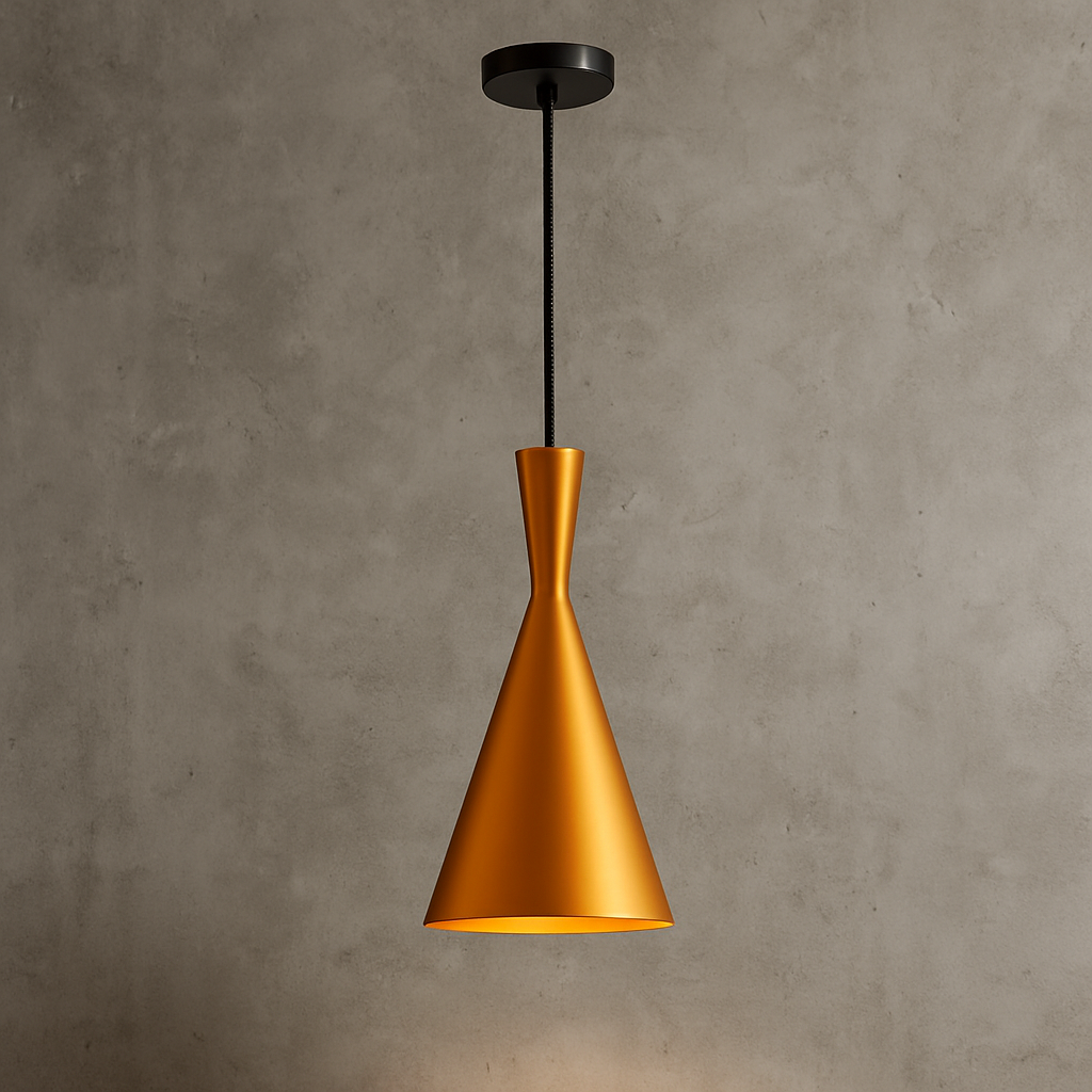 El Geisha 1 Golden es una lámpara colgante de diseño contemporáneo inspirada en el estilo icónico del diseñador Tom Dixon. Fabricada en aluminio de alta calidad, presenta un acabado exterior en electroplating cobre dorado y un interior en tono cobre brillante, creando un juego de reflejos cálidos y sofisticados que realza la estética de cualquier ambiente.