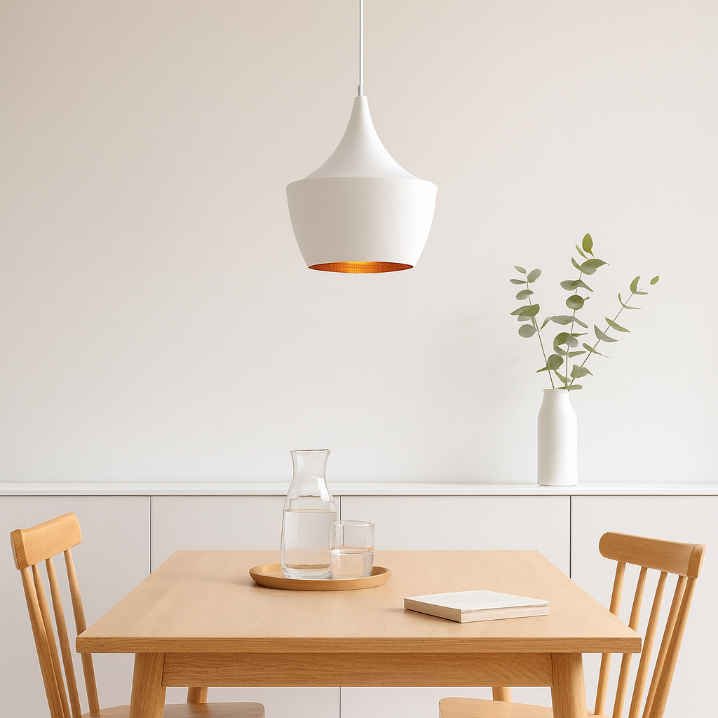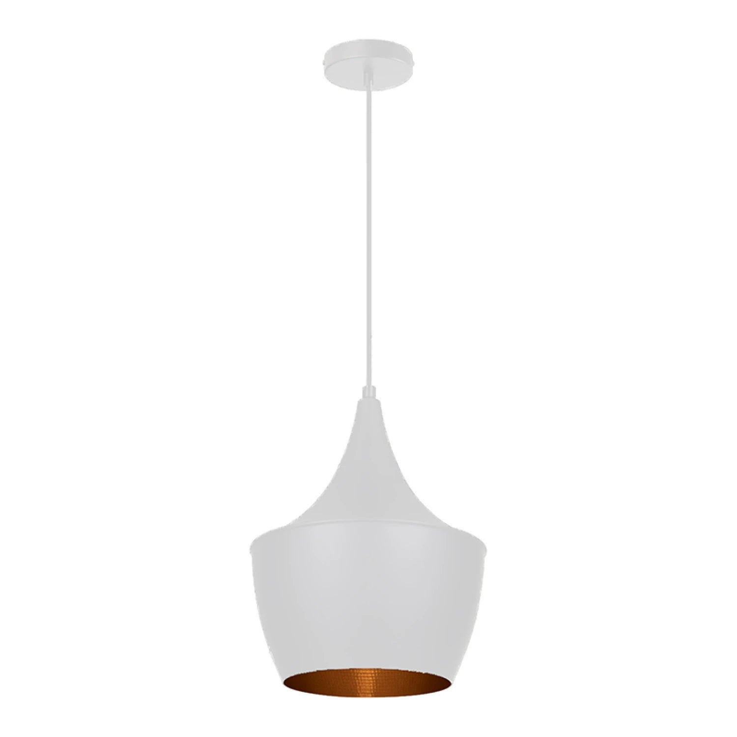 La Lámpara Colgante ARTEFACTO CAMPANA DECORATIVA GEISHA 2 BLANCA presenta un diseño exterior en blanco y negro con un interior de color cobre. Fabricada en aluminio, sus dimensiones son 24 cm de diámetro y 30 cm de altura, creada por TOM DIXON.