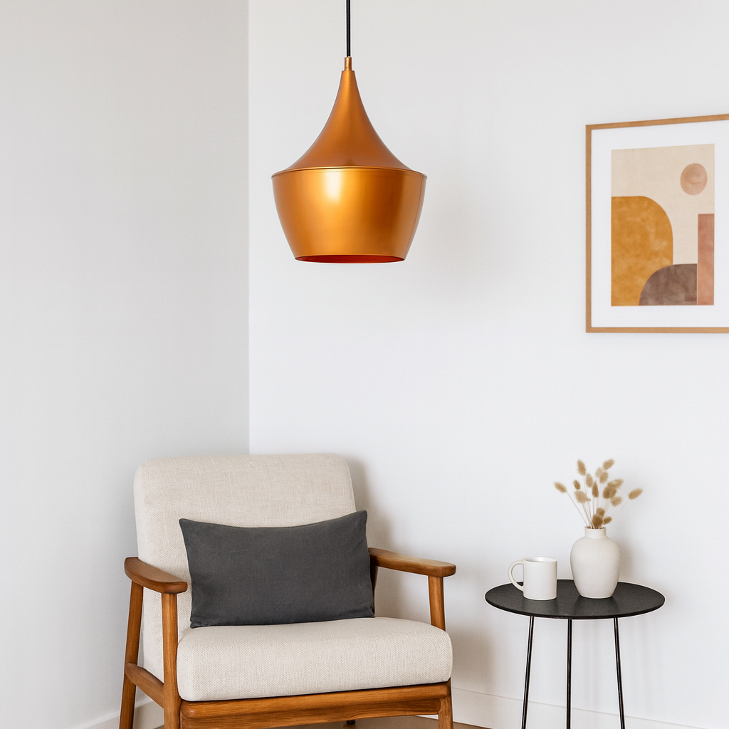 La campana decorativa Geisha 2 Golden de Artefacto es una lámpara colgante que combina diseño sofisticado y funcionalidad. Está elaborada en aluminio con galvanoplastia en color cobre tanto en su exterior como en su interior, lo que aporta una estética cálida y contemporánea. Con un diámetro de 24 cm y una altura de 30 cm, es una pieza compacta que aporta elegancia y carácter a cualquier espacio. Inspirada en el estilo industrial de Tom Dixon, esta lámpara es ideal para iluminar ambientes con estilo, aportando un toque de distinción y calidad en su acabado.