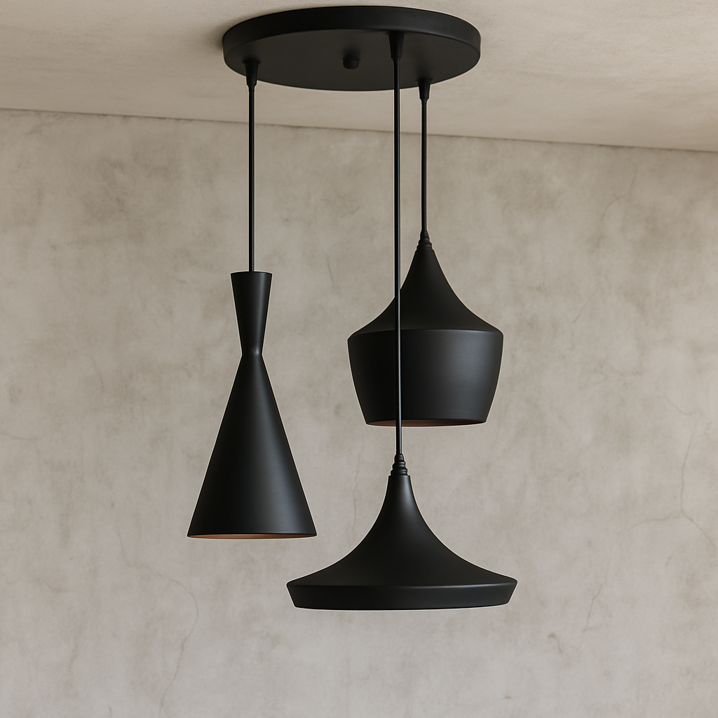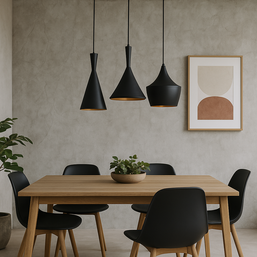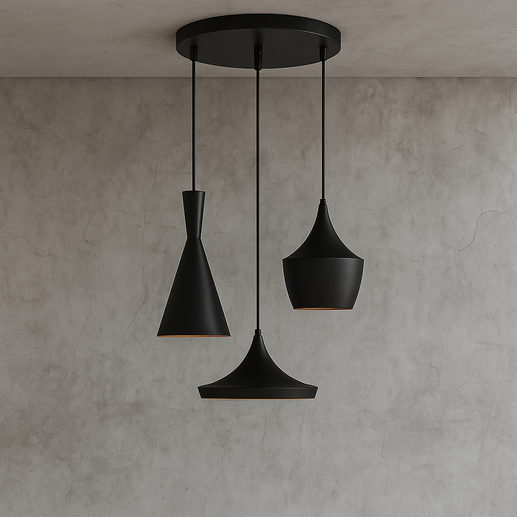 Un diseño moderno y sofisticado que combina la elegancia del negro mate con el interior en cobre, creando un juego de luces cálidas y acogedoras. Ideal para comedores, cocinas, livings o bares, aportando estilo y personalidad al ambiente.