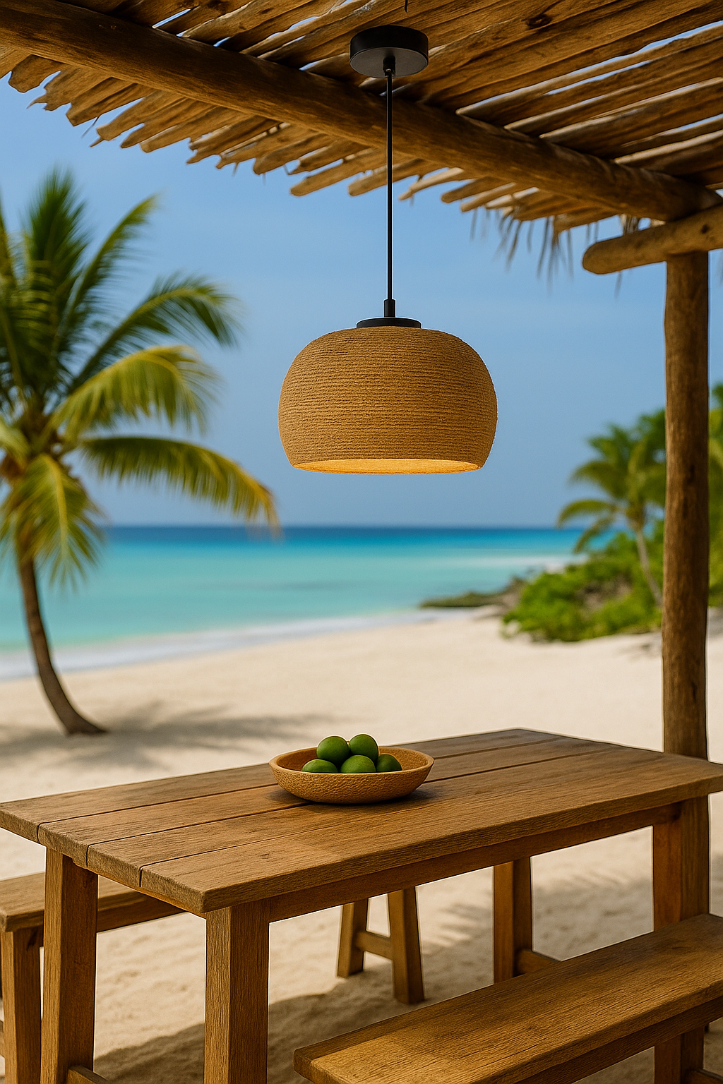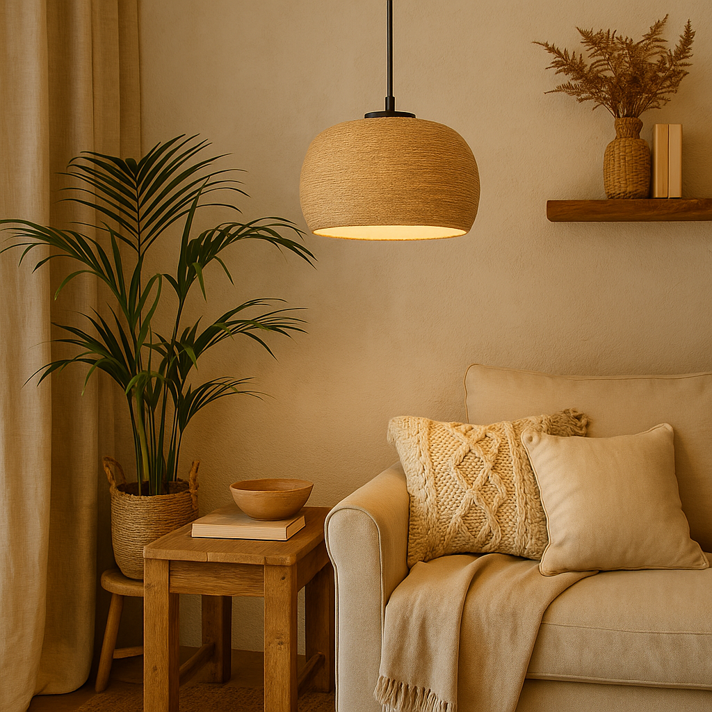 El colgante Guadalupe está elaborado en ratán natural, ofreciendo un diseño artesanal que aporta calidez y un estilo bohemio a cualquier ambiente. Su pantalla trenzada permite el paso de la luz de forma tenue y envolvente, creando un clima acogedor y relajante. Es ideal para salones, comedores, dormitorios o espacios de estilo costero y rústico. Funciona con portalámpara E27 de hasta 40W y se adapta perfectamente a decoraciones modernas y boho chic.