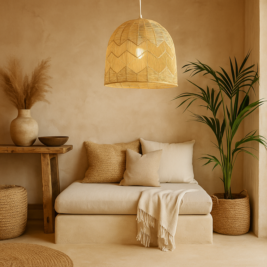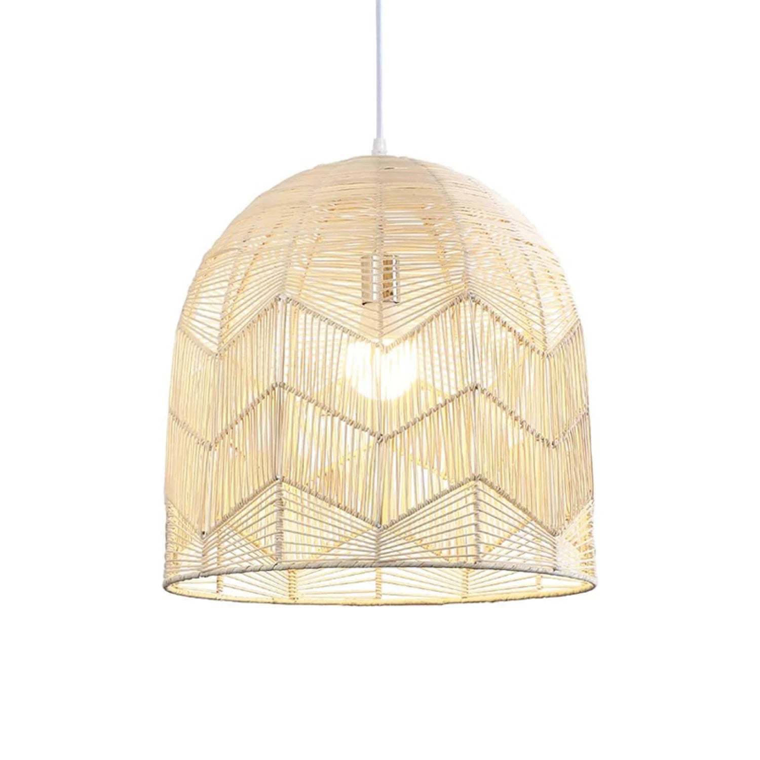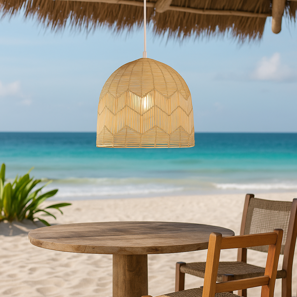 Lámpara colgante decorativa Mérida, elaborada en metal y rattán con un diseño artesanal de líneas geométricas que proyecta una iluminación cálida y envolvente. Sus medidas de 46 cm de diámetro por 46 cm de alto la convierten en una pieza de impacto visual, perfecta para realzar livings, comedores, galerías o espacios con estilo boho y tropical. Aporta un toque natural y sofisticado, combinando elegancia y frescura en la decoración.
