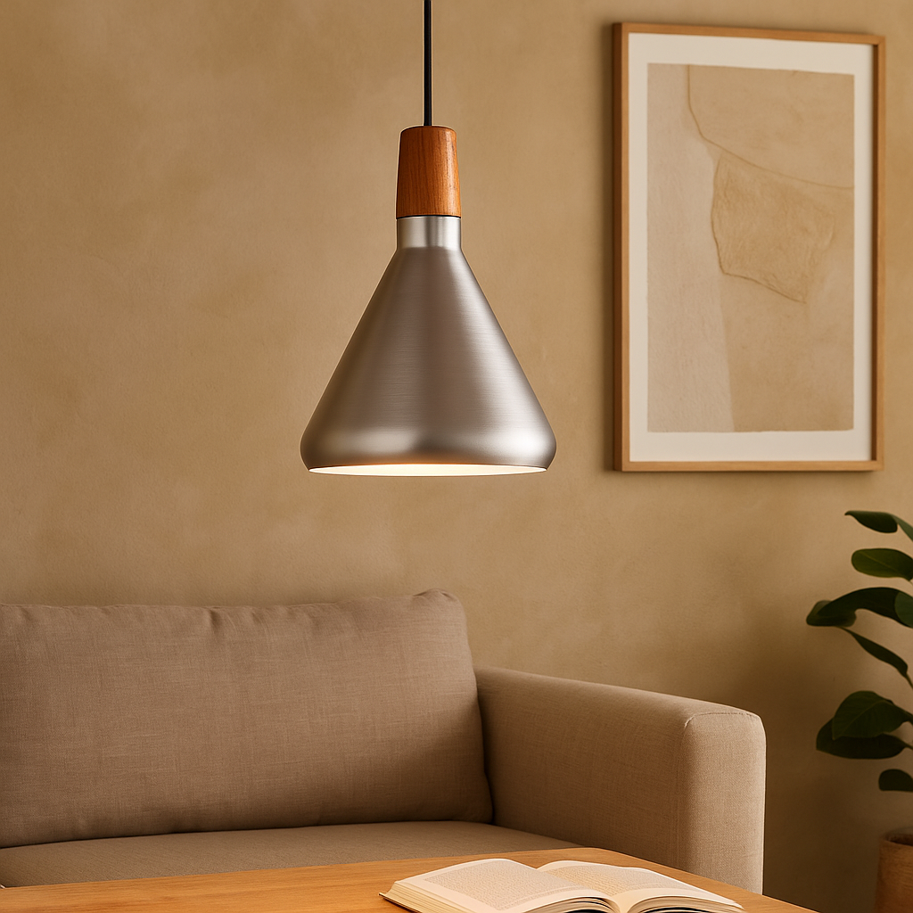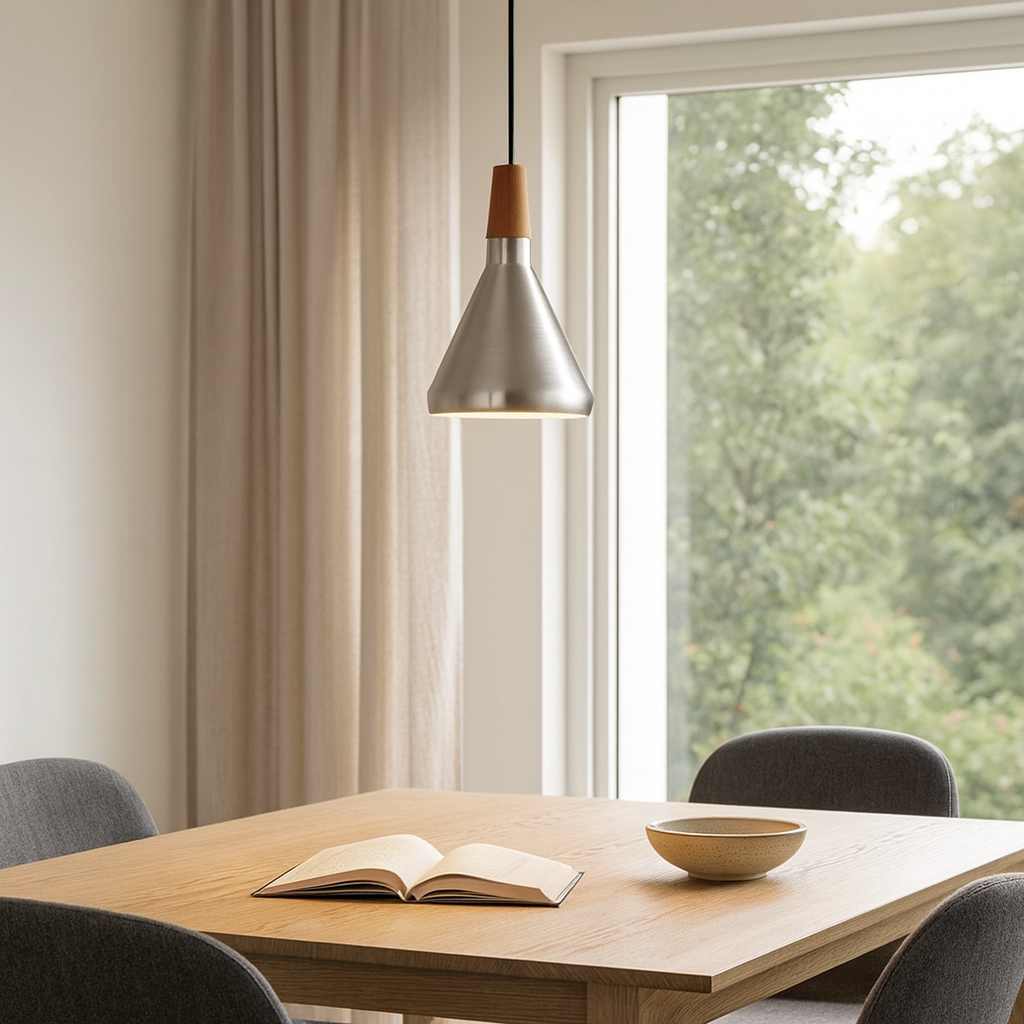 Un diseño elegante y moderno que combina la sofisticación del acabado cromado con la calidez del detalle en madera. Su tamaño compacto (D180) lo convierte en una opción ideal para iluminar mesas de comedor, barras de cocina o espacios de lectura, aportando un toque contemporáneo y acogedor. Fabricado en metal y madera de alta calidad, este colgante es perfecto para ambientes minimalistas y modernos que buscan estilo y funcionalidad en una sola pieza.