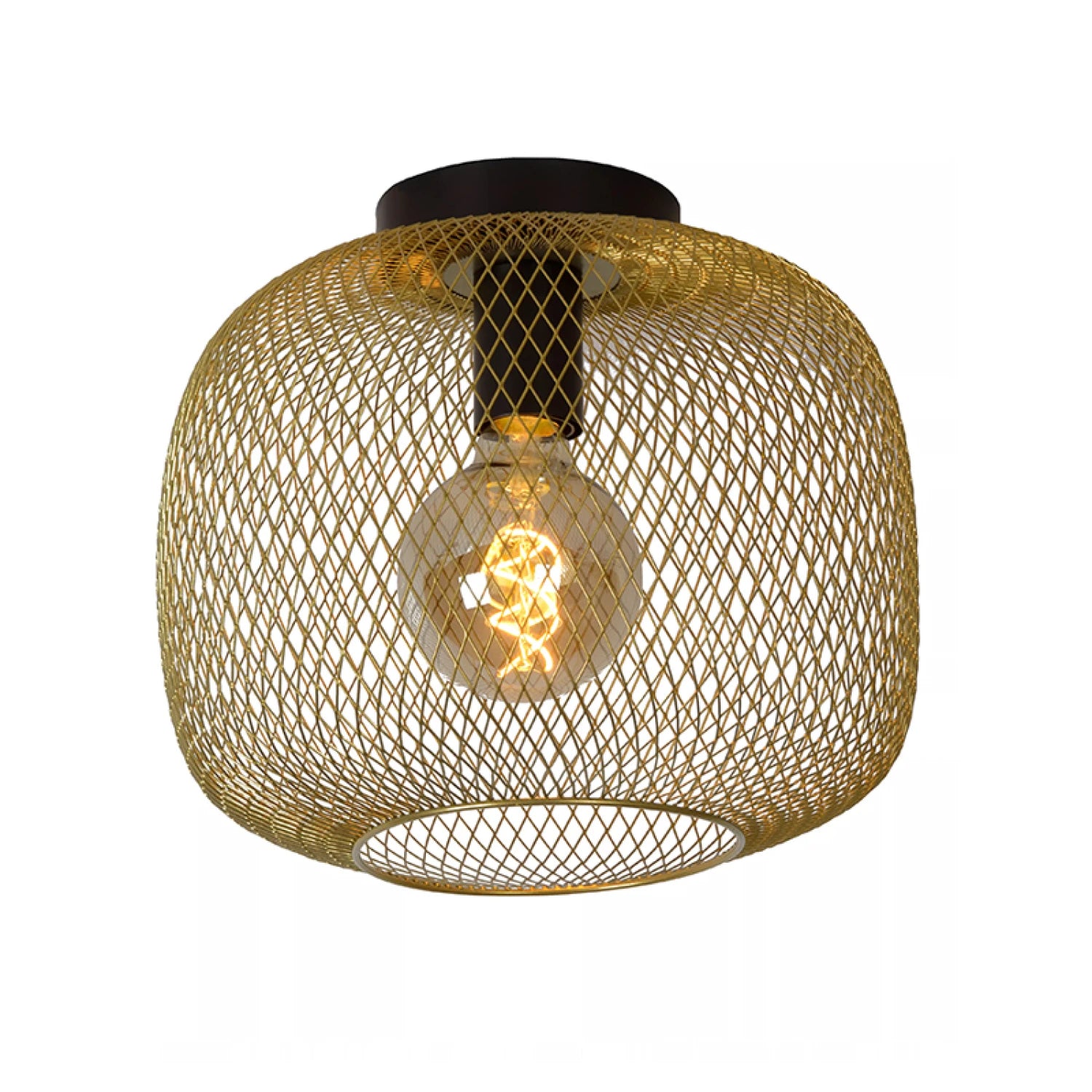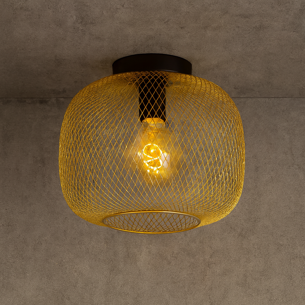 Elegancia y diseño se encuentran en el artefacto de techo Oklahoma Dorado. Su estructura metálica en acabado dorado, con un delicado entramado calado, permite que la luz se filtre de manera cálida y sofisticada, creando un juego de sombras único en cada ambiente.