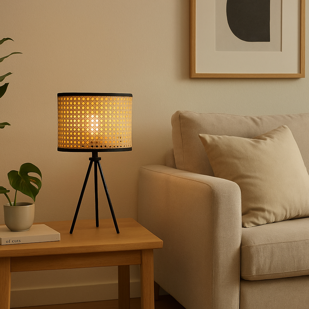 La Lámpara de Mesa Amelio destaca por su pantalla de ratán artesanal, que filtra la luz de manera cálida y acogedora, creando un ambiente relajante y sofisticado. Su base metálica trípode en acabado negro aporta estabilidad y un contraste elegante, ideal para complementar espacios con estilo contemporáneo o boho chic.