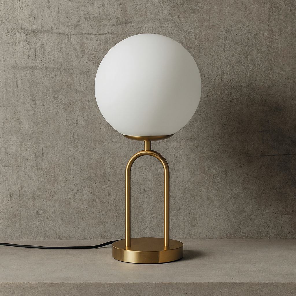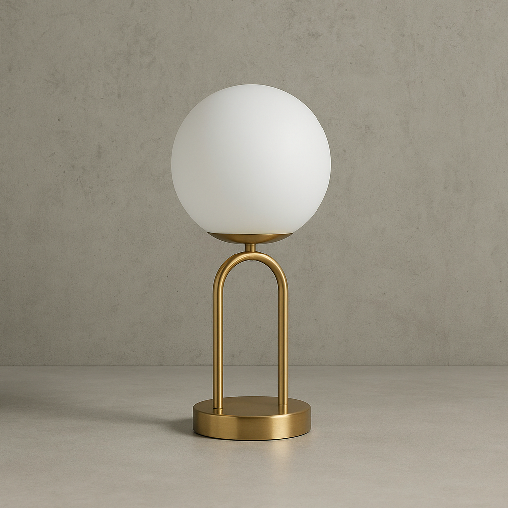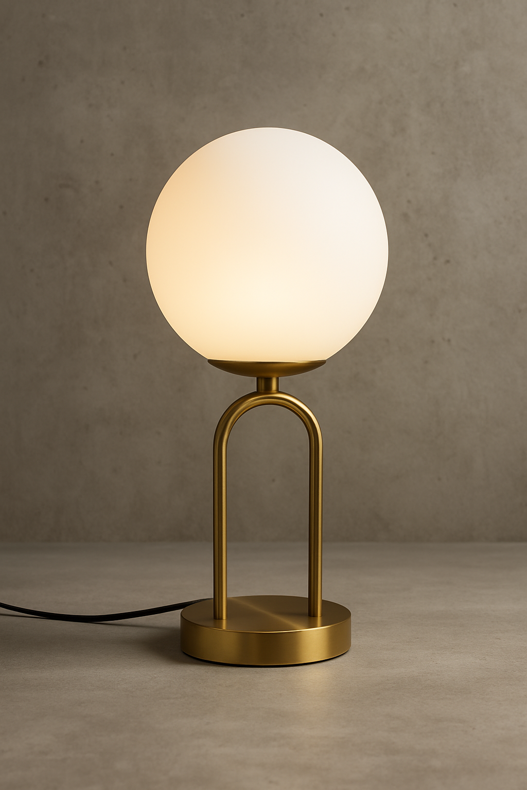 La lámpara de mesa BAKE combina diseño minimalista y materiales de alta calidad para aportar estilo y calidez a cualquier espacio. Con su base en acabado dorado y pantalla esférica blanca en material rotomolding, ofrece una luz suave y elegante perfecta para crear ambientes acogedores.