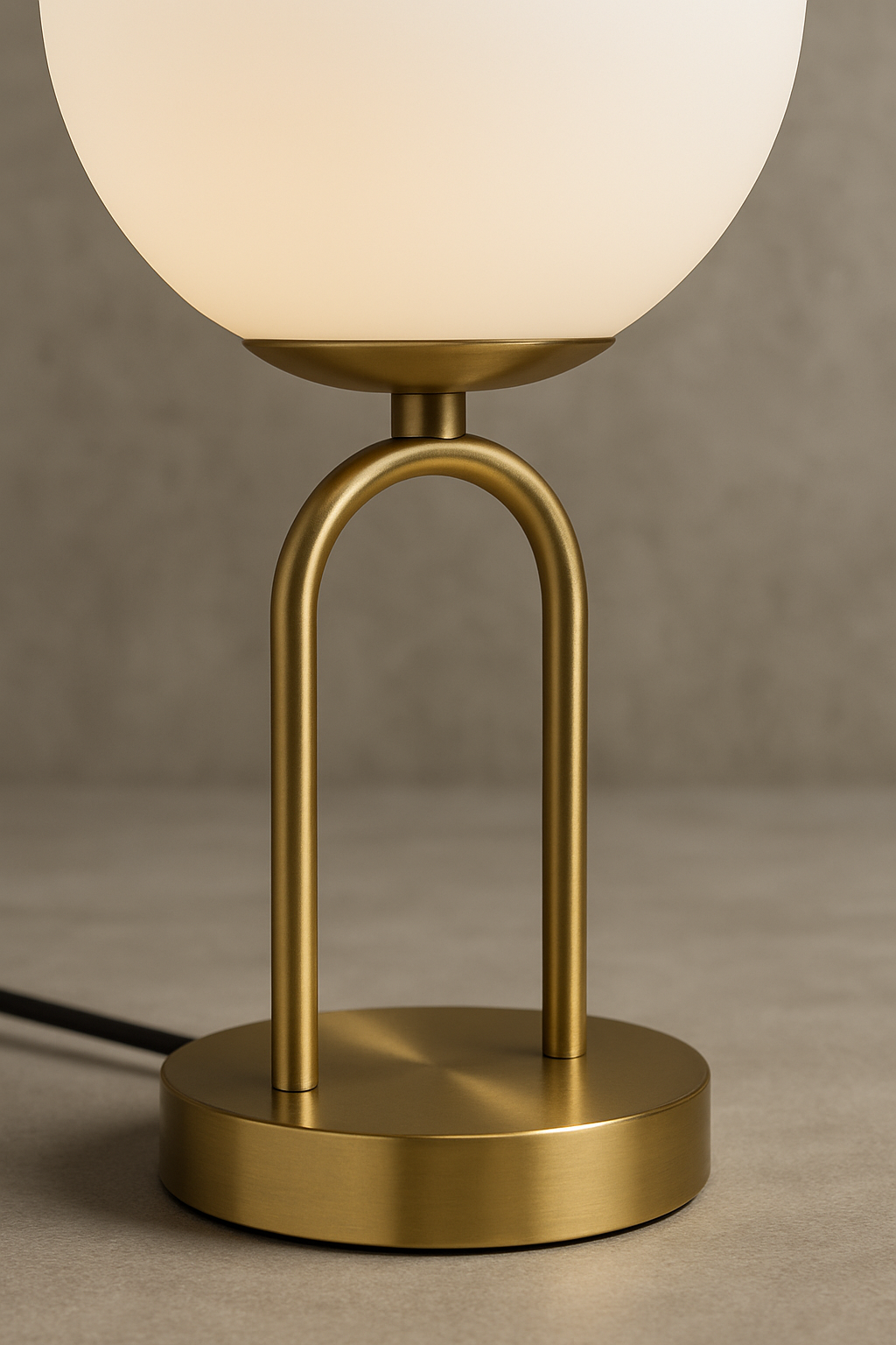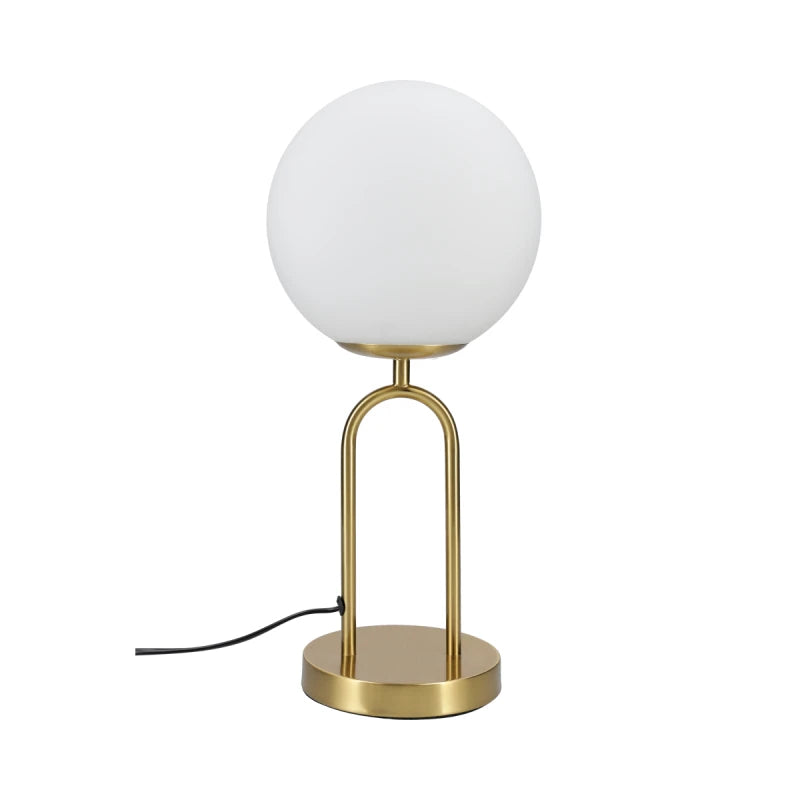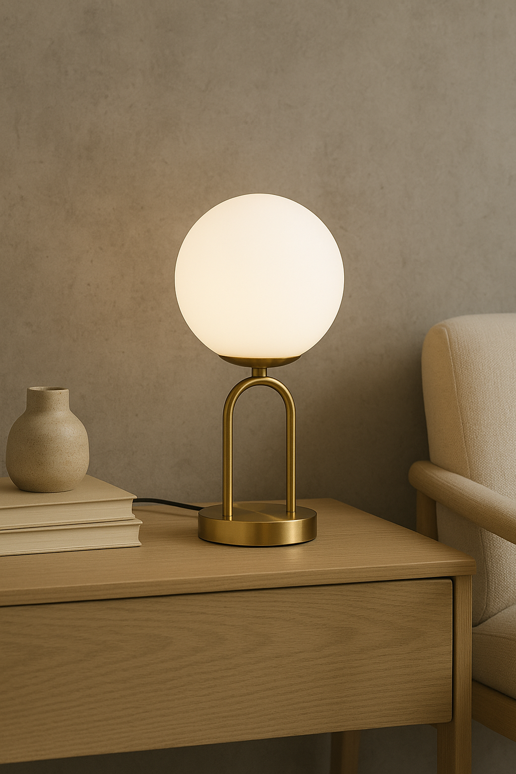 La lámpara de mesa BAKE combina diseño minimalista y materiales de alta calidad para aportar estilo y calidez a cualquier espacio. Con su base en acabado dorado y pantalla esférica blanca en material rotomolding, ofrece una luz suave y elegante perfecta para crear ambientes acogedores.