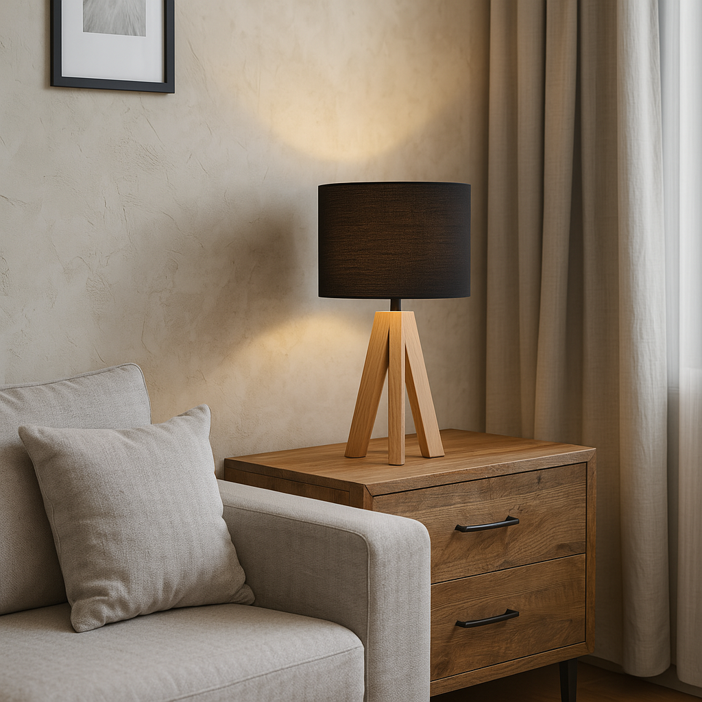 Diseño: pantalla textil negra sobre trípode de madera natural, líneas limpias que combinan calidez y modernidad.