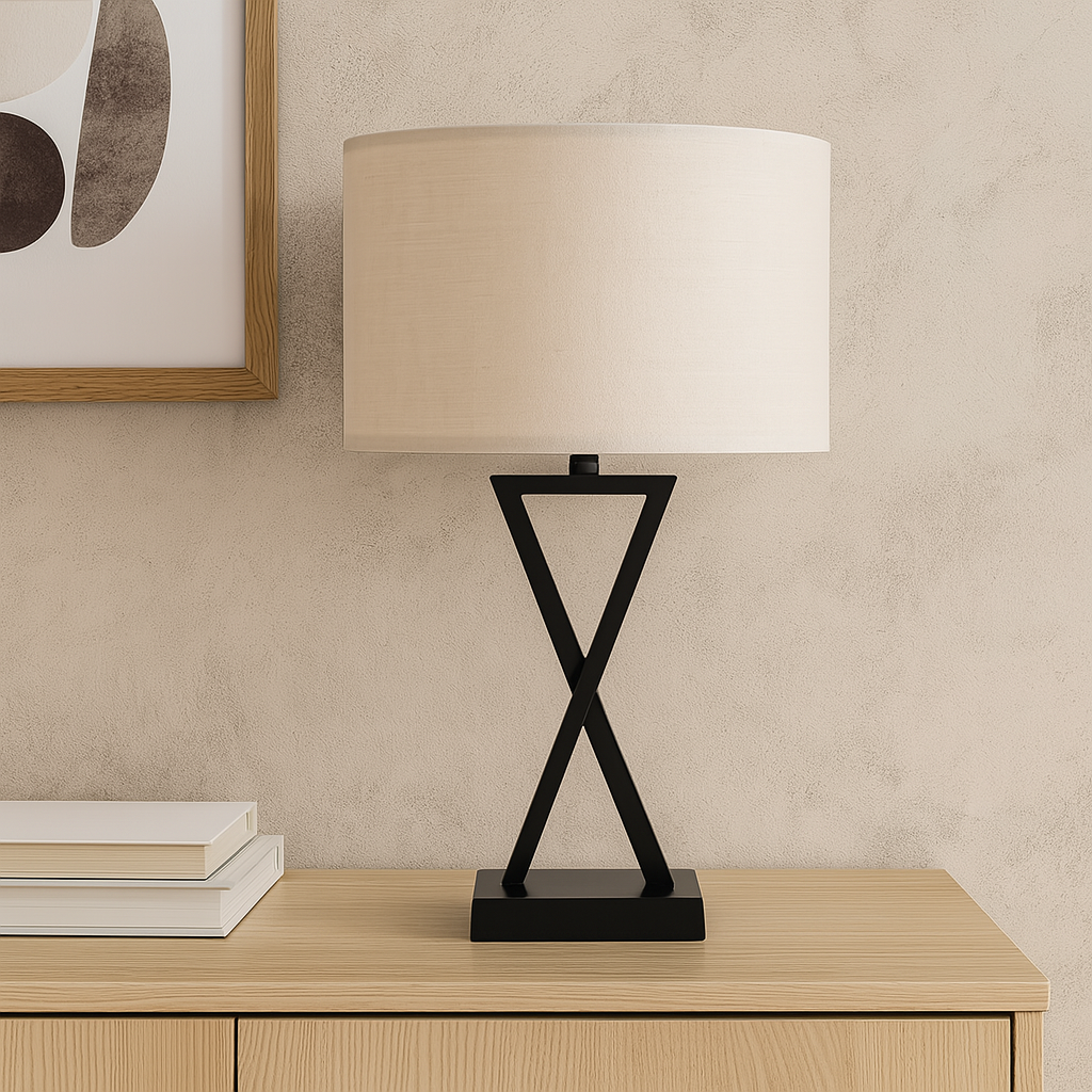 La Laura destaca por su base geométrica en forma de “X”, fabricada en metal negro mate, y su pantalla cilíndrica de tela blanca que difunde una luz suave y envolvente. Con 56 cm de alto y 27 cm de diámetro, es perfecta para mesitas de noche, escritorios o aparadores modernos. Utiliza un casquillo E27 (bombilla LED no incluida) y cuenta con interruptor en el cable para un encendido cómodo. Su diseño contemporáneo combina con estilos industrial, nórdico o minimalista, aportando un toque de elegancia y contraste a cualquier ambiente.
