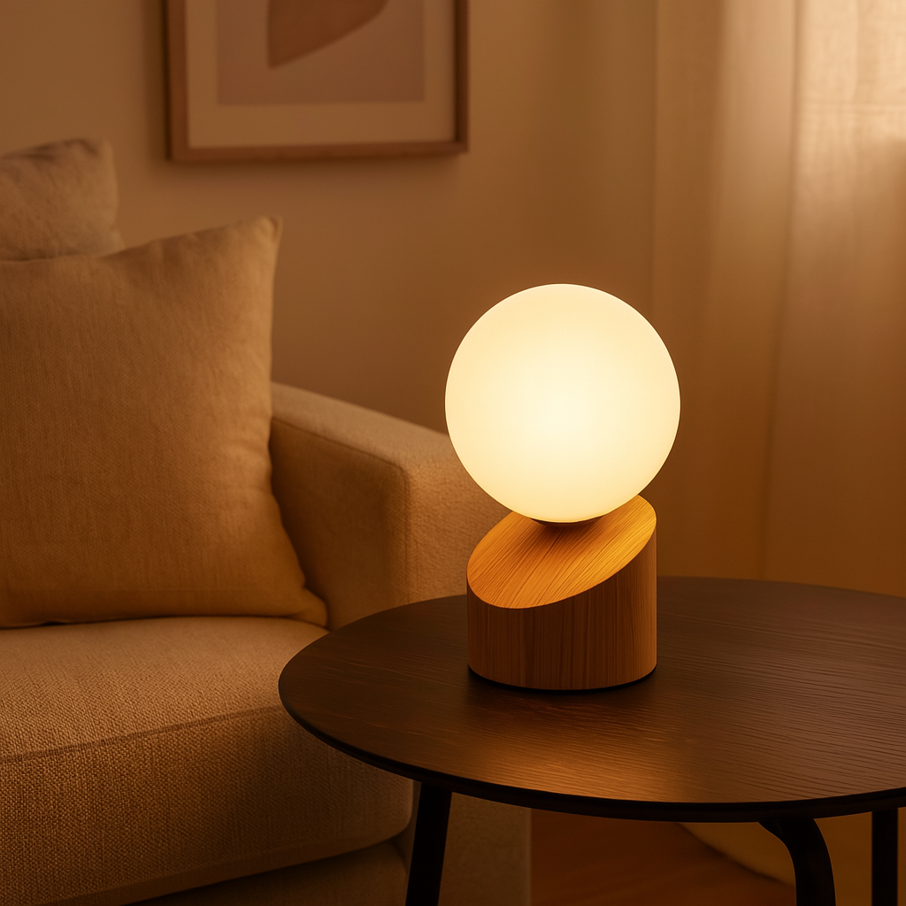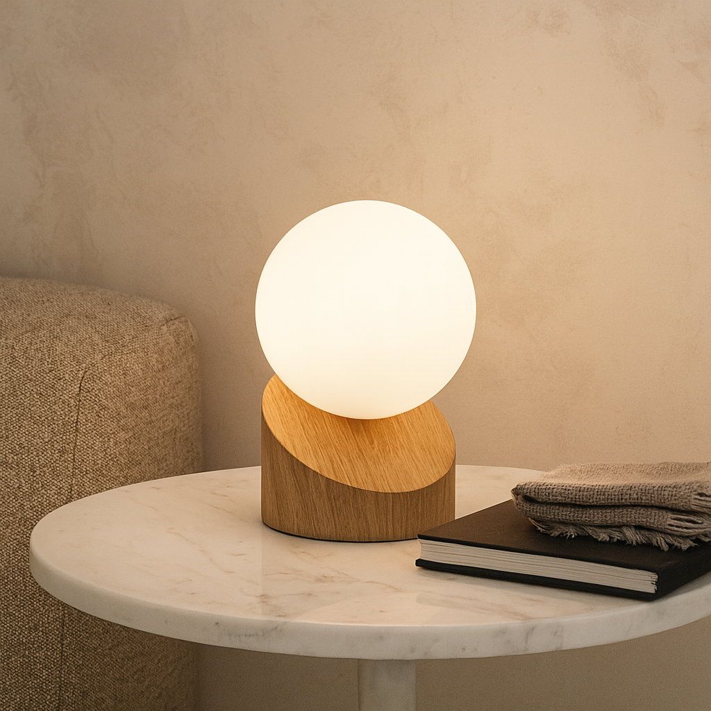 Diseño: esfera opalina blanca que reposa sobre una base cilíndrica de madera natural, creando un contraste elegante y minimalista.