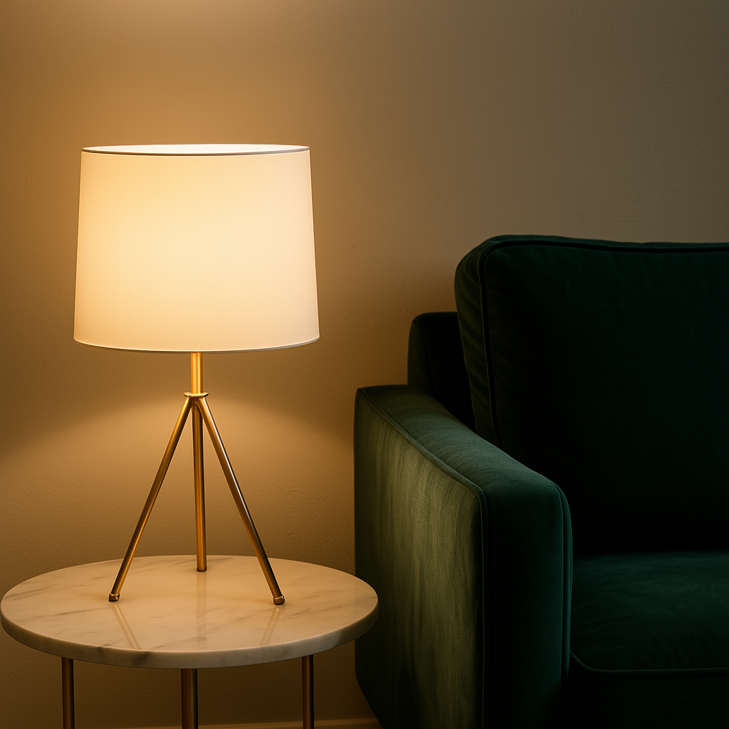 Un acento dorado que eleva cualquier ambiente. La Oregón Gold combina una estilizada base trípode de metal acabado oro con una pantalla cilíndrica textil en tono marfil que suaviza la luz y crea un halo cálido y acogedor. Con 55 cm de alto y 35 cm de diámetro, es el punto de luz perfecto para mesitas de noche, aparadores o rincones de lectura.