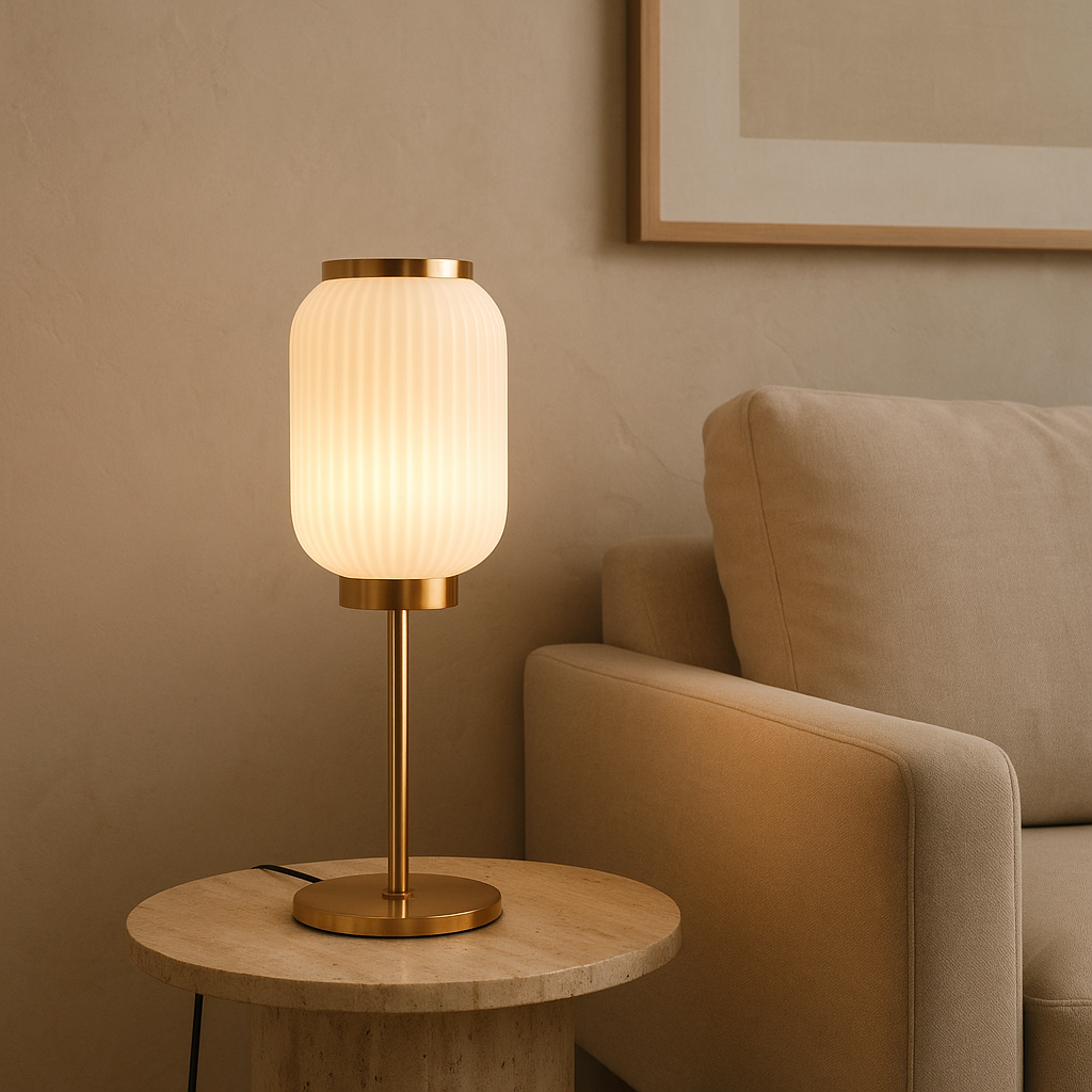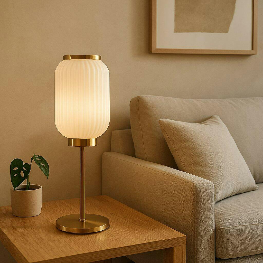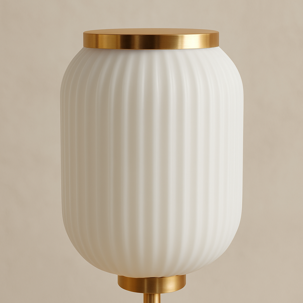 La Lámpara de Mesa Pirce destaca por su pantalla de vidrio opal estriado, que suaviza y difunde la luz de manera uniforme, creando un ambiente cálido y acogedor. Su estructura metálica en acabado bronce pulido aporta un toque de lujo y distinción, convirtiéndola en una pieza decorativa perfecta para salones, dormitorios o espacios de trabajo con estilo.