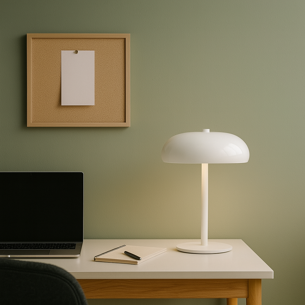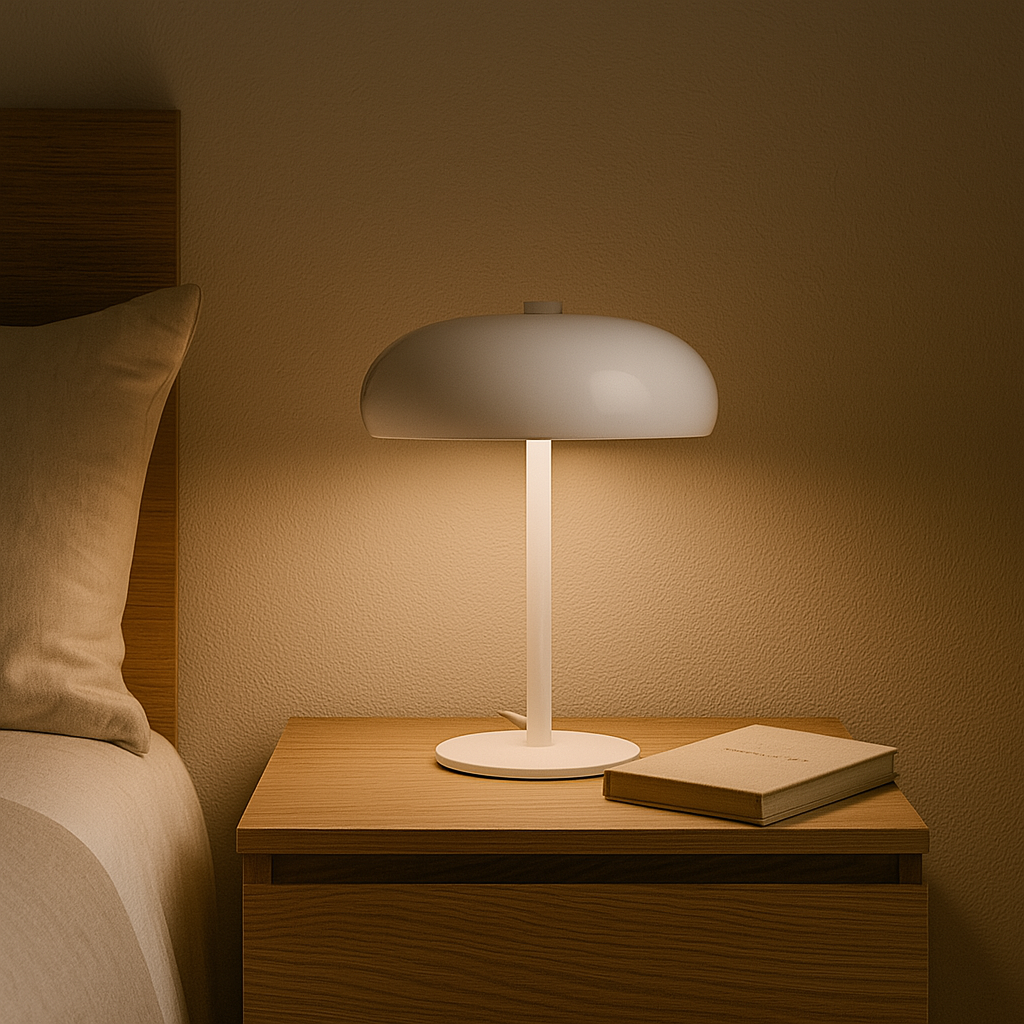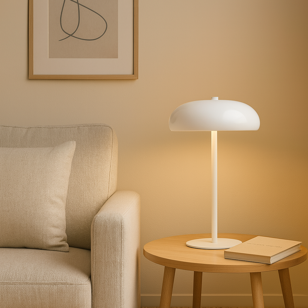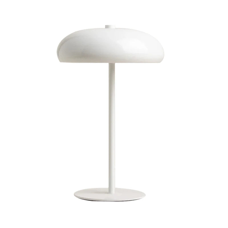 Lámpara de mesa tipo “mushroom” en metal blanco lacado, 30 cm de alto, 19cm de ancho y 10 cm de diámetro. Su acabado brillante refleja la luz de forma suave, mientras la pantalla semiesférica dirige la iluminación hacia abajo creando un halo cálido perfecto para lectura o ambientación. Incluye portalámpara E14 compatible con bombillas LED de hasta 6 W (no incluida) y base antideslizante que protege la superficie. Un acento fresco y versátil que realza espacios nórdicos, minimalistas o mid-century con un toque impoluto y contemporáneo.