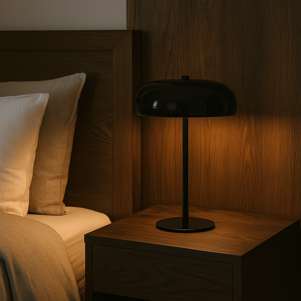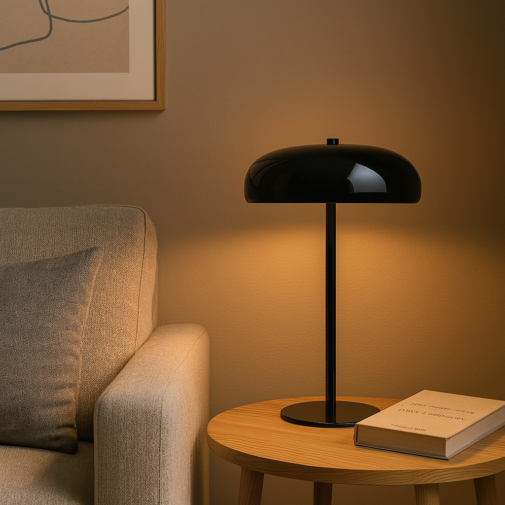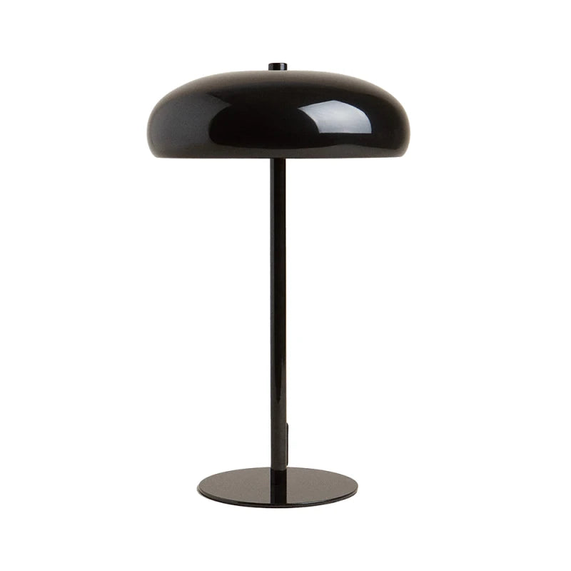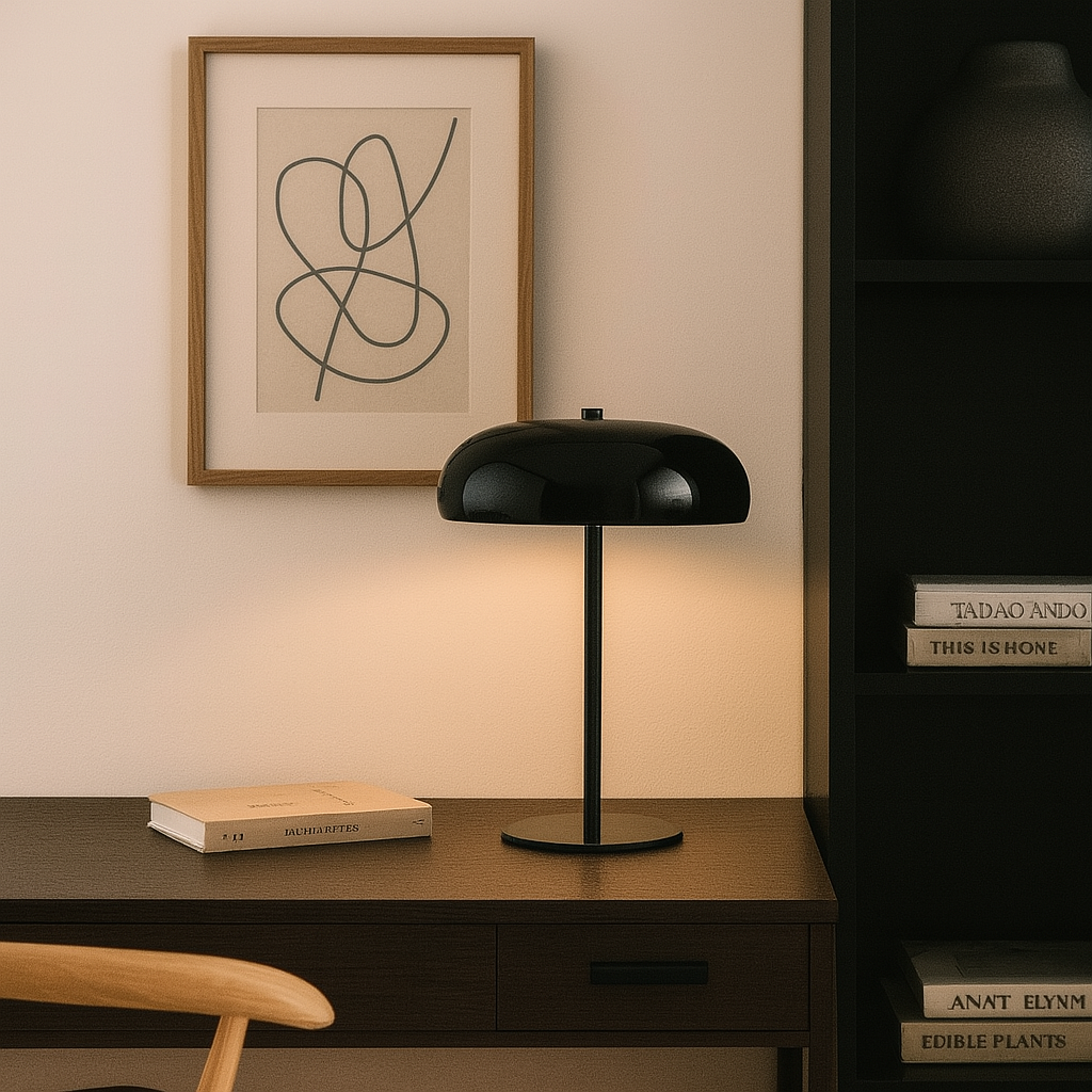 Lámpara de mesa tipo “mushroom” en metal negro brillante, 30 cm de alto, 19cm de ancho y 10 cm de diámetro. Su acabado lacado aporta un aire sofisticado y contemporáneo, mientras la pantalla semiesférica dirige la luz hacia abajo creando un halo cálido perfecto para lectura o ambientación. Incorpora portalámpara E14 compatible con bombillas LED de hasta 6 W (no incluida) y base antideslizante para proteger la superficie. Un acento versátil que eleva espacios minimalistas, nórdicos o mid-century con un toque de elegancia monocromática.