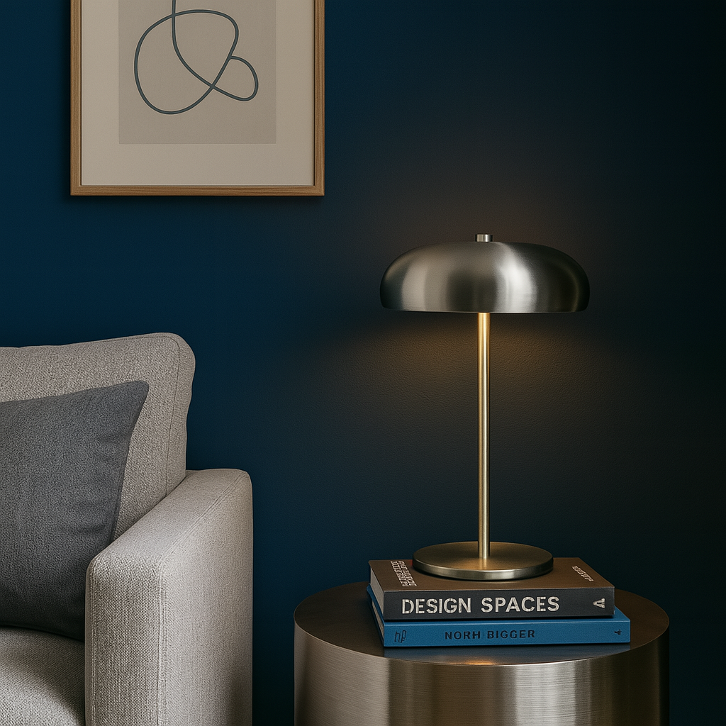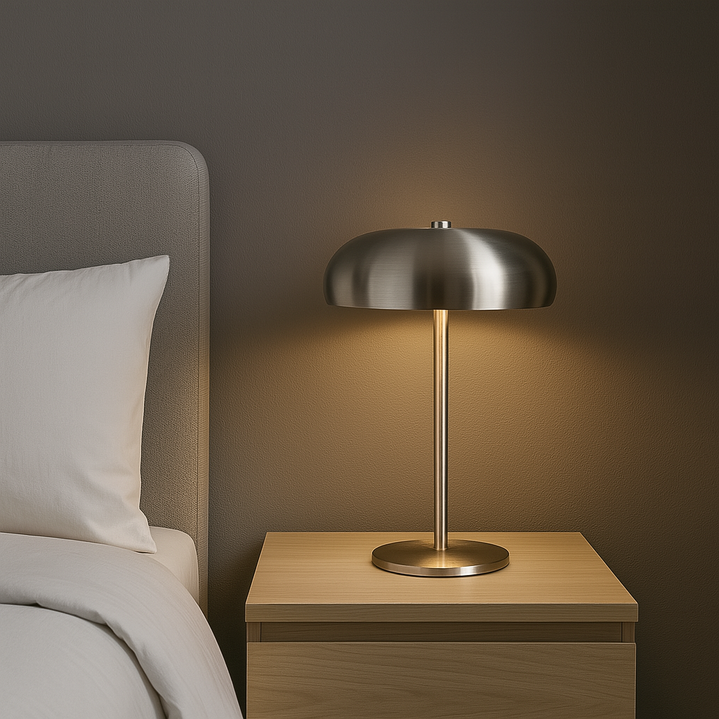 Lámpara de mesa tipo “mushroom” en acero inoxidable cepillado, 30 cm de alto, 19cm de ancho y 10 cm de diámetro.. Su acabado plateado satinado refleja la luz con elegancia y aporta un toque industrial chic a livings, dormitorios u oficinas. La pantalla semiesférica dirige la iluminación hacia abajo, creando un halo cálido y sin deslumbramientos, ideal para lectura o ambientación. Incorpora portalámpara E14 compatible con bombillas LED de hasta 6 W (no incluida) y cuenta con base antideslizante para proteger la superficie. Diseño atemporal que encaja en espacios modernos, nórdicos o minimalistas.