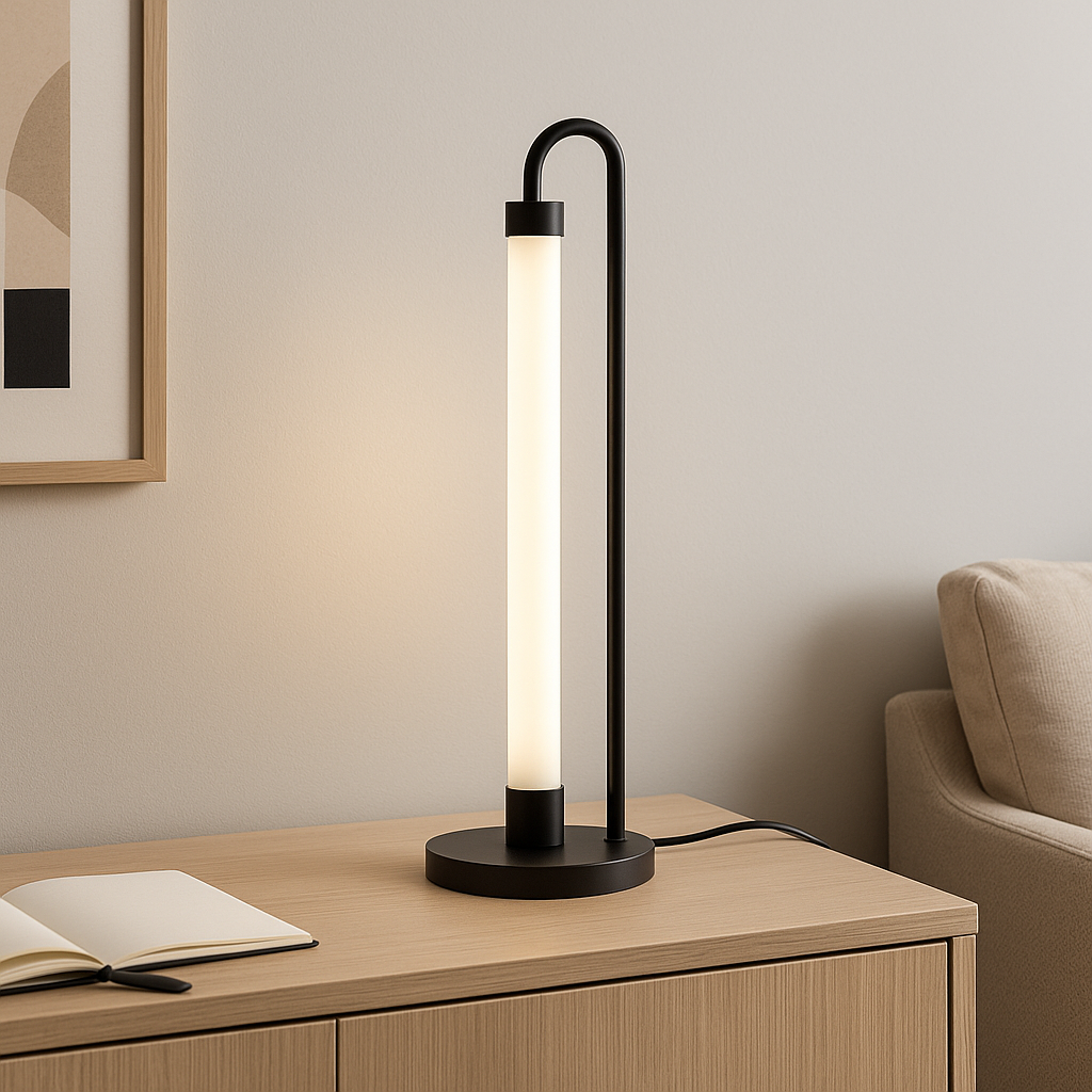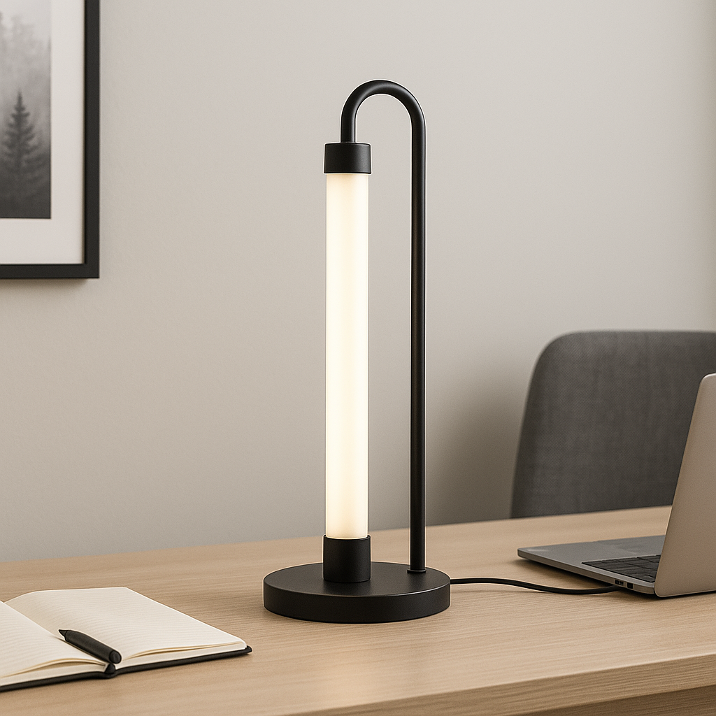 La Seattle es una lámpara de mesa compacta y vanguardista que aporta luz ambiental moderna a escritorios, consolas o mesas auxiliares. Su tubo difusor de acrílico blanco (27 mm de diámetro) se integra a una estructura metálica negra mate, logrando un contraste elegante y minimalista. Con solo 67,5 cm de alto y una base circular de 27,5 cm, cabe cómodamente en superficies reducidas sin sacrificar presencia.