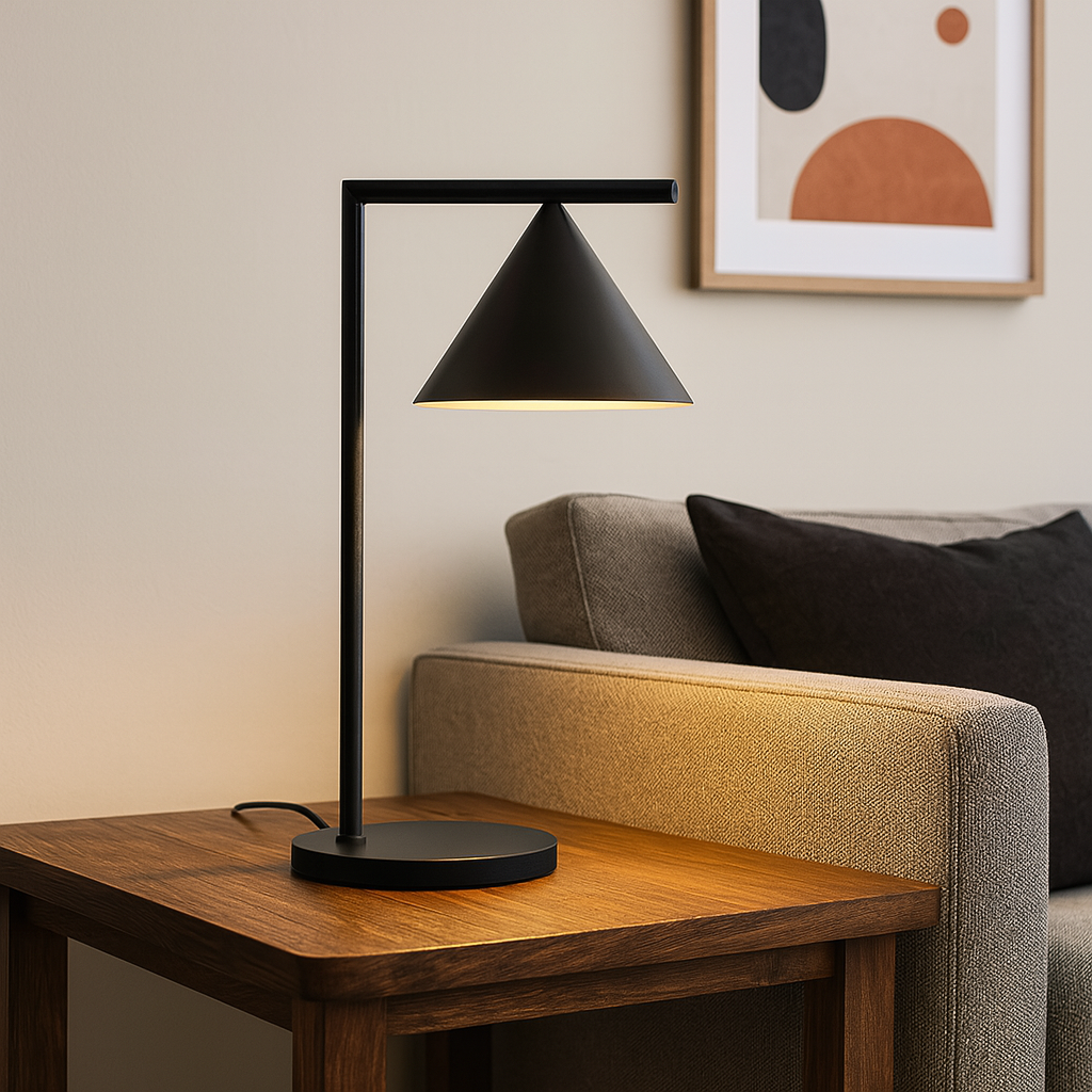 La Stella negra eleva el minimalismo a un nuevo nivel. Su estructura de hierro acabado en negro seda traza un ángulo limpio que sostiene una pantalla cónica suspendida; el interior refleja la luz con calidez, creando un halo íntimo sobre el escritorio o la mesa auxiliar. La base circular de mármol negro pulido —con vetas sutiles que cambian con la luz— ancla la pieza y aporta presencia escultórica. Equipada con un portalámparas E27 (bombilla no incluida), te permite elegir la temperatura y el flujo ideales para cada ambiente. Un diseño sobrio y atemporal pensado para conquistar tanto espacios de trabajo como rincones de relax con una dosis de elegancia discreta.