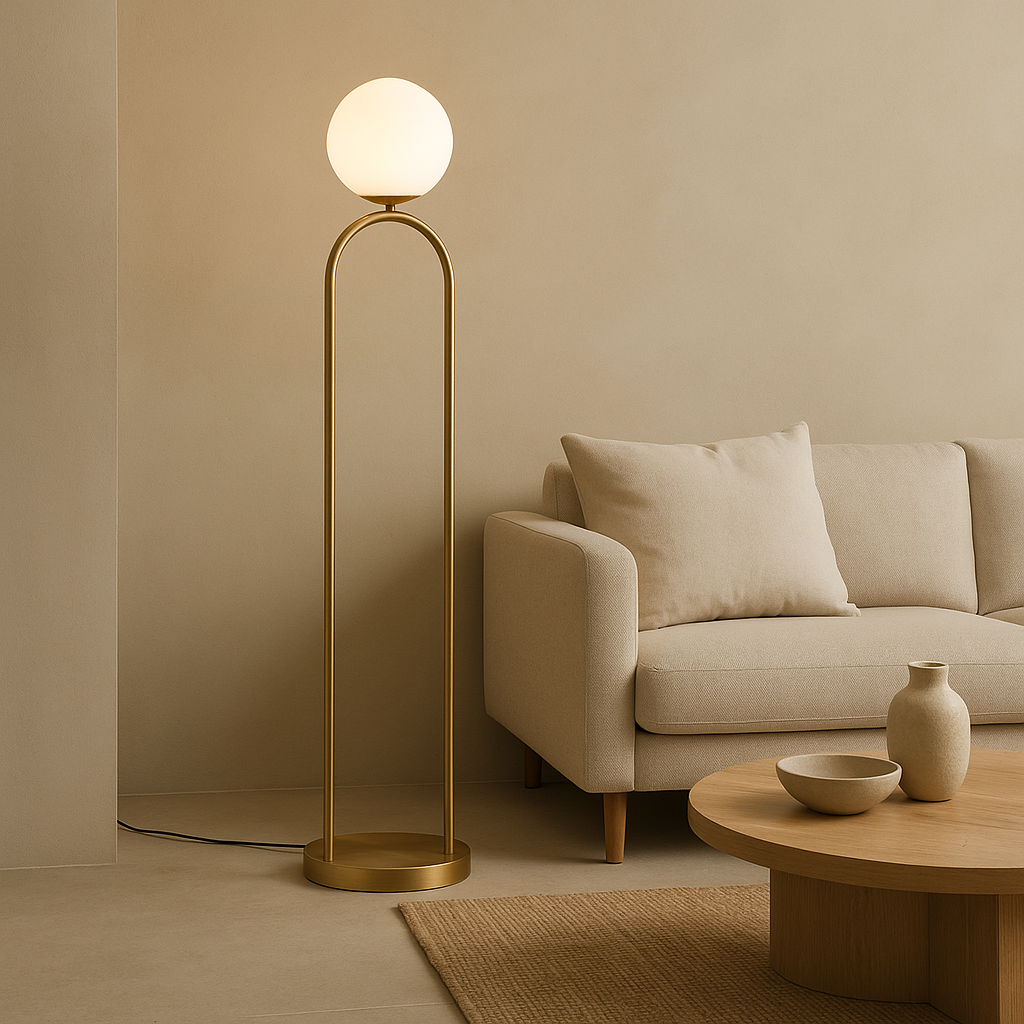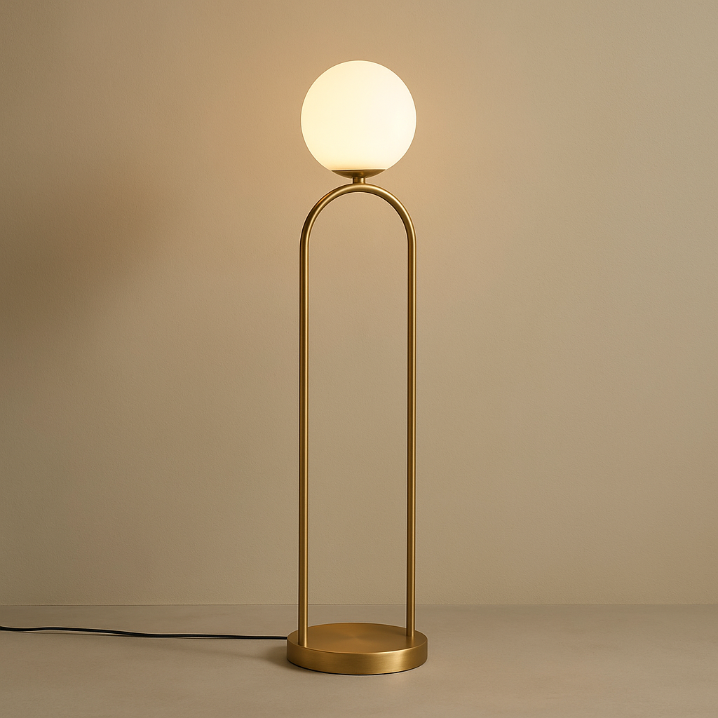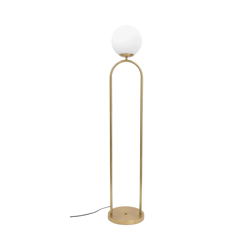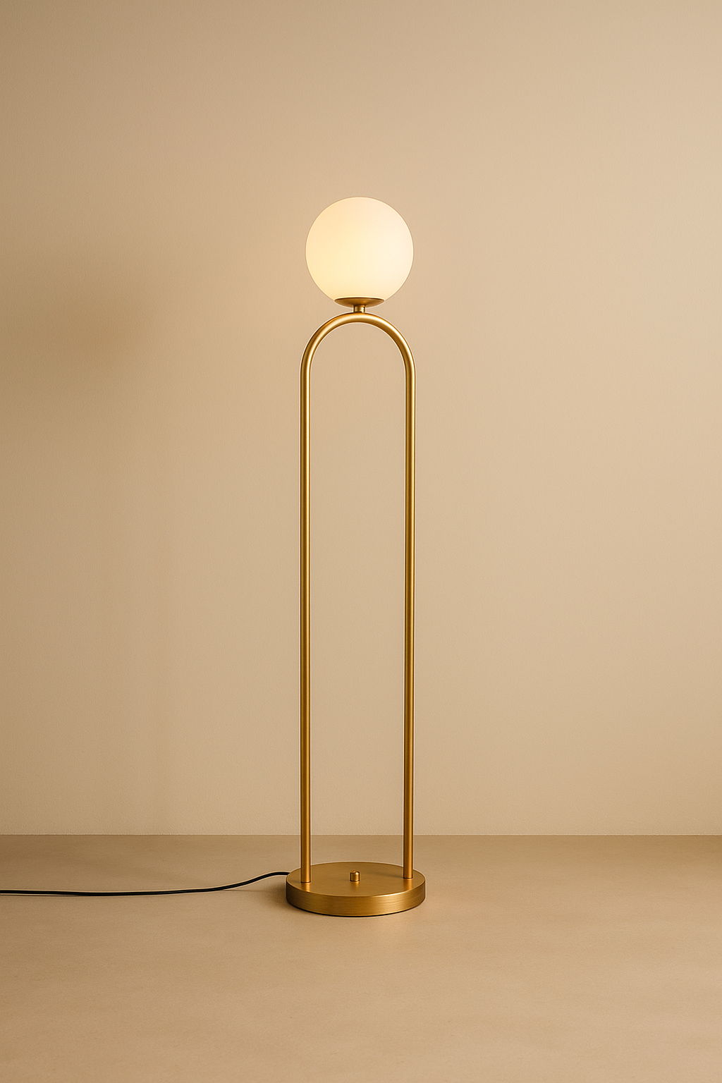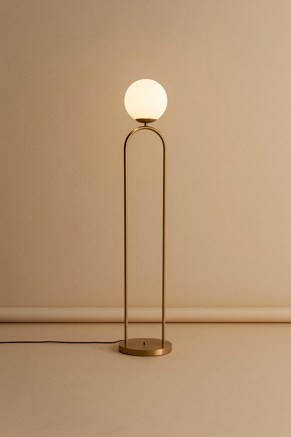 Elegancia y diseño minimalista se unen en la lámpara de pie BAKE. Con estructura en acabado dorado brass y pantalla esférica que difunde una luz cálida y envolvente, esta pieza es ideal para aportar un toque moderno y sofisticado a tu espacio.