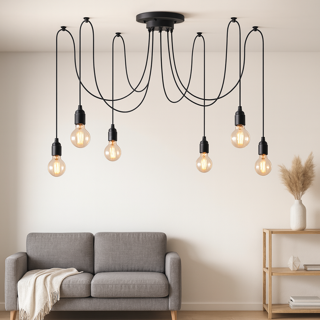 El ARTEFACTO PARA TECHO VINTAGE SPIDER destaca por su diseño vintage industrial, que combina plástico y hierro para ofrecer una estructura resistente y duradera. Cuenta con seis portalámparas E27 que permiten instalar diversas combinaciones de bombillas, adaptándose a la intensidad y estilo de iluminación deseados. Su cable de 1.8 metros facilita una instalación flexible y segura, ideal para techos de distintas alturas. Este artefacto se entrega sin bombillas, lo que permite seleccionar las fuentes de luz que mejor complementen su ambiente. Es la opción perfecta para aportar un toque sofisticado y contemporáneo a cualquier espacio.