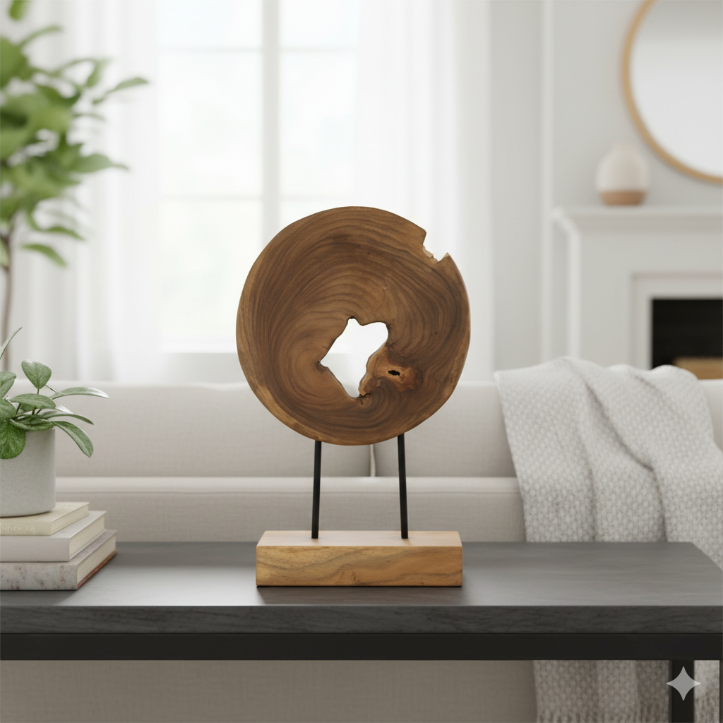 Diseño: Escultura de madera orgánica con un acabado natural y una base robusta.