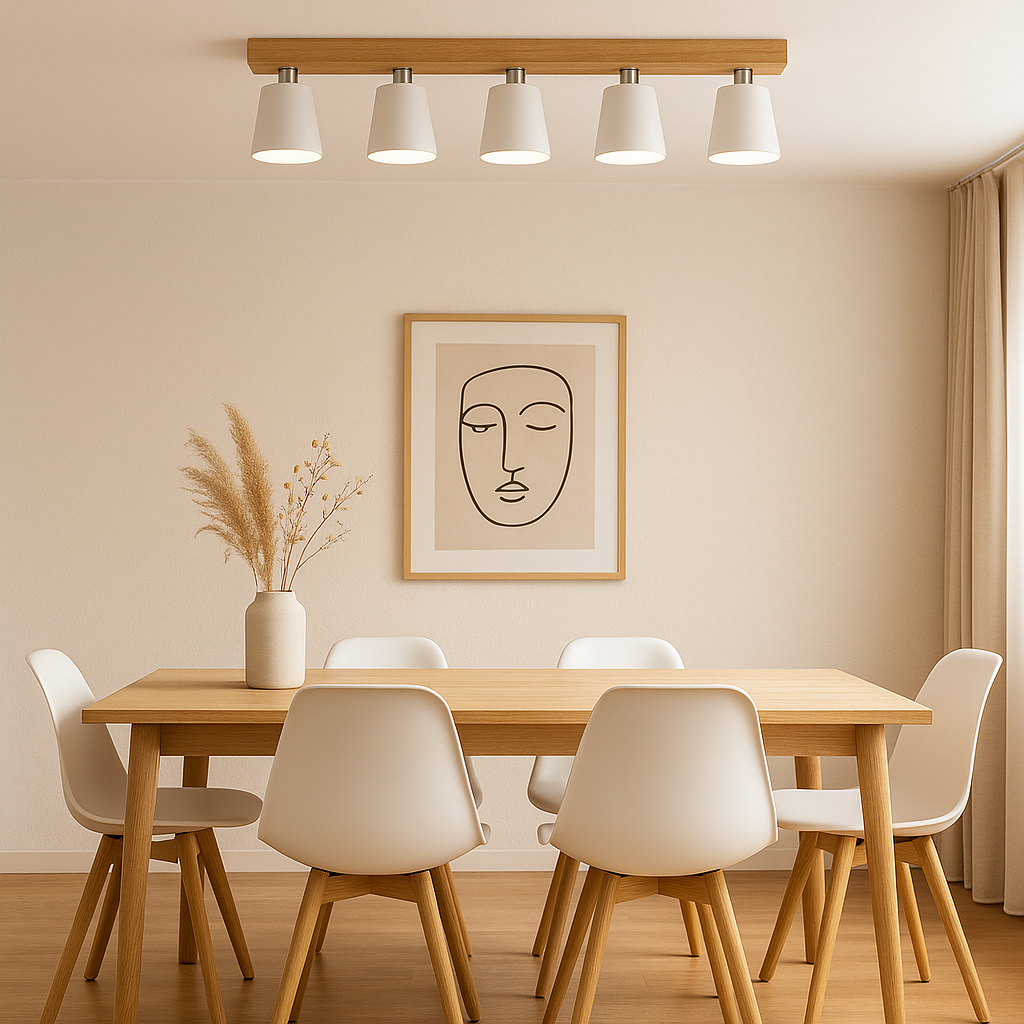 El COLGANTE NURIA es una luminaria colgante de diseño elegante que combina madera y metal para aportar un toque cálido y moderno a cualquier ambiente. Cuenta con cinco portalámparas E27, lo que permite una iluminación potente y versátil, adecuada tanto para espacios residenciales como comerciales. Sus dimensiones de 100 cm de largo por 22,5 cm de ancho lo hacen ideal para colocarlo sobre mesas de comedor, barras de cocina o zonas de trabajo, proporcionando una luz equilibrada y agradable. Su construcción robusta y el acabado en materiales naturales garantizan durabilidad y un estilo atemporal, perfecto para proyectos de iluminación sofisticados y funcionales.