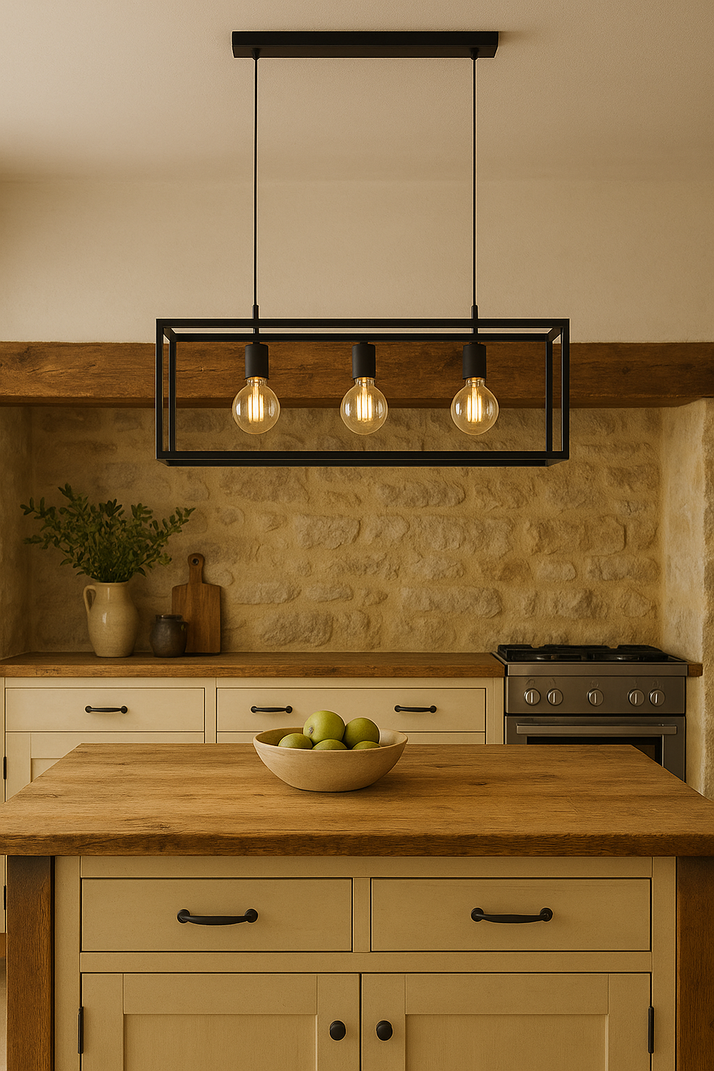 Colgante con diseño de reja metálica y vidrio transparente, 3 portalámparas E27. Este colgante industrial proporciona una iluminación brillante y moderna, perfecta para espacios de estilo contemporáneo. Altura: 1100mm.