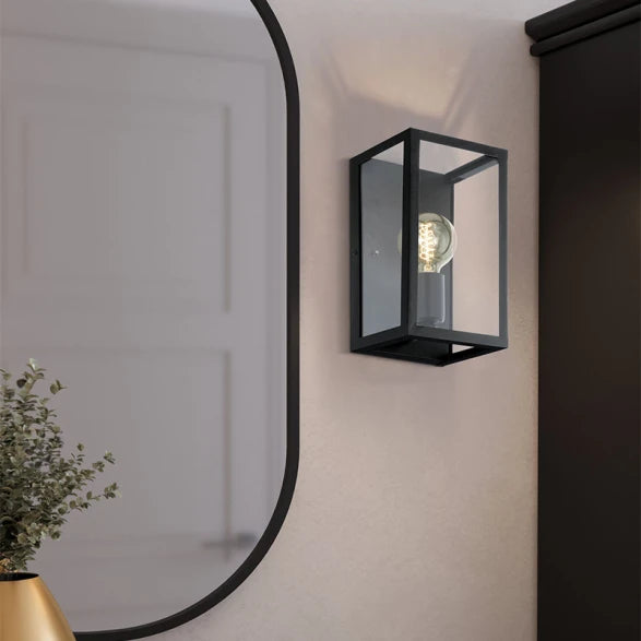 Aplique con diseño en reja metálica y vidrio transparente, base E27. Aporta un estilo rústico y elegante, perfecto para iluminar espacios con una luz cálida y funcional.Alto; 28cm. Ancho; 16cm.