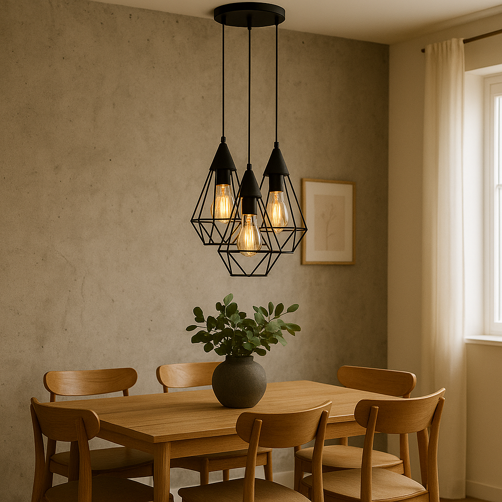 Colgante con diseño de triple reja negra, 3 portalámparas E27, ideal para proporcionar una iluminación focalizada y decorativa en ambientes modernos. Con un diámetro de 175mm, este colgante aporta un toque industrial y elegante a cualquier espacio. Altura: 1100mm. Lamparita no incluida.