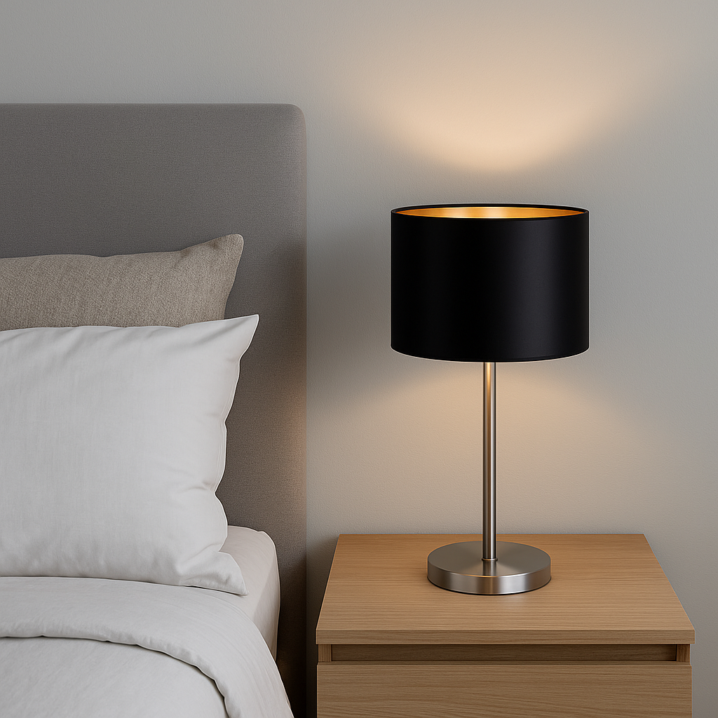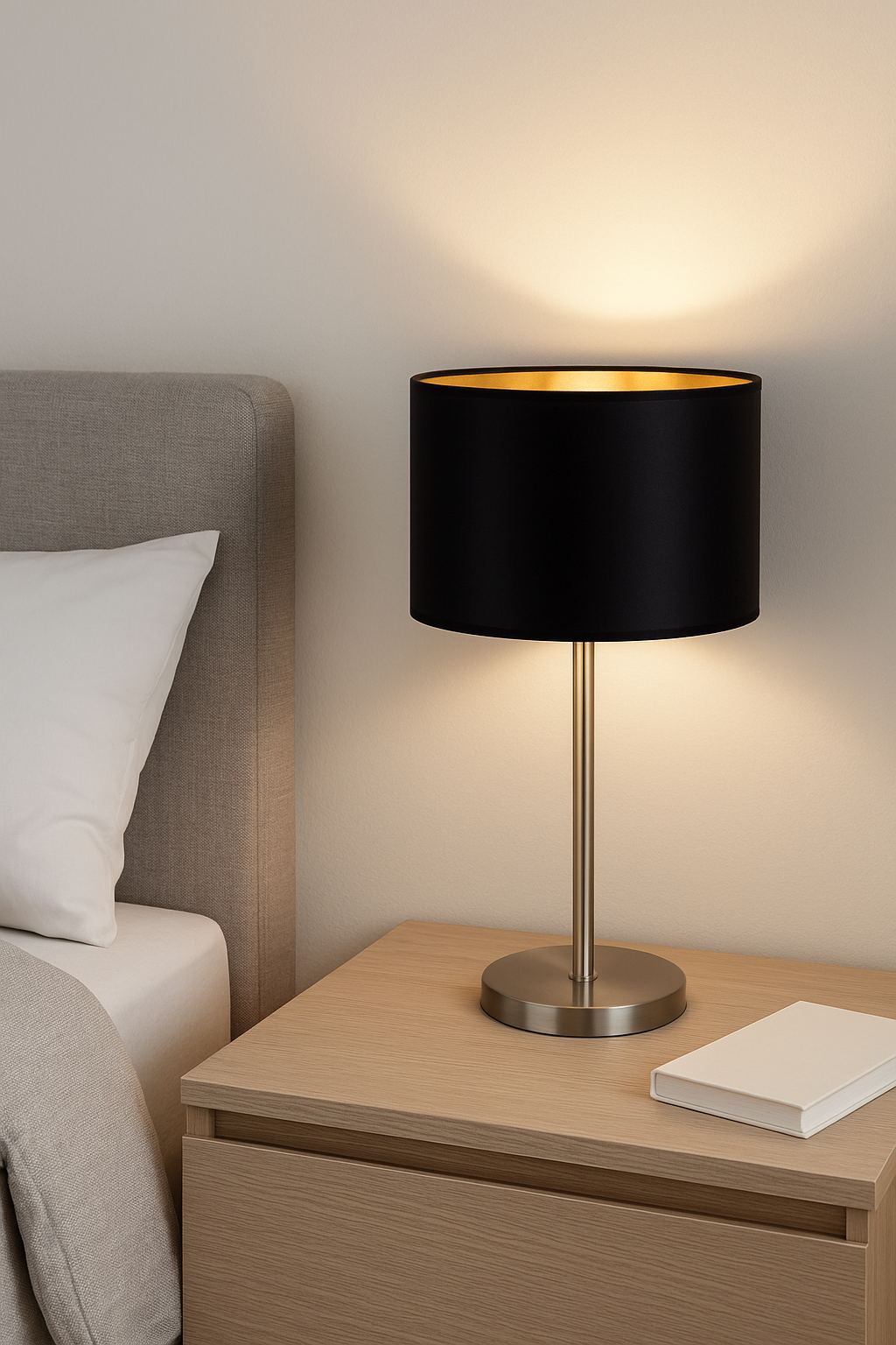 El contraste entre la tela negra y la base niquelada le da un aire sofisticado a esta lámpara de mesa.
