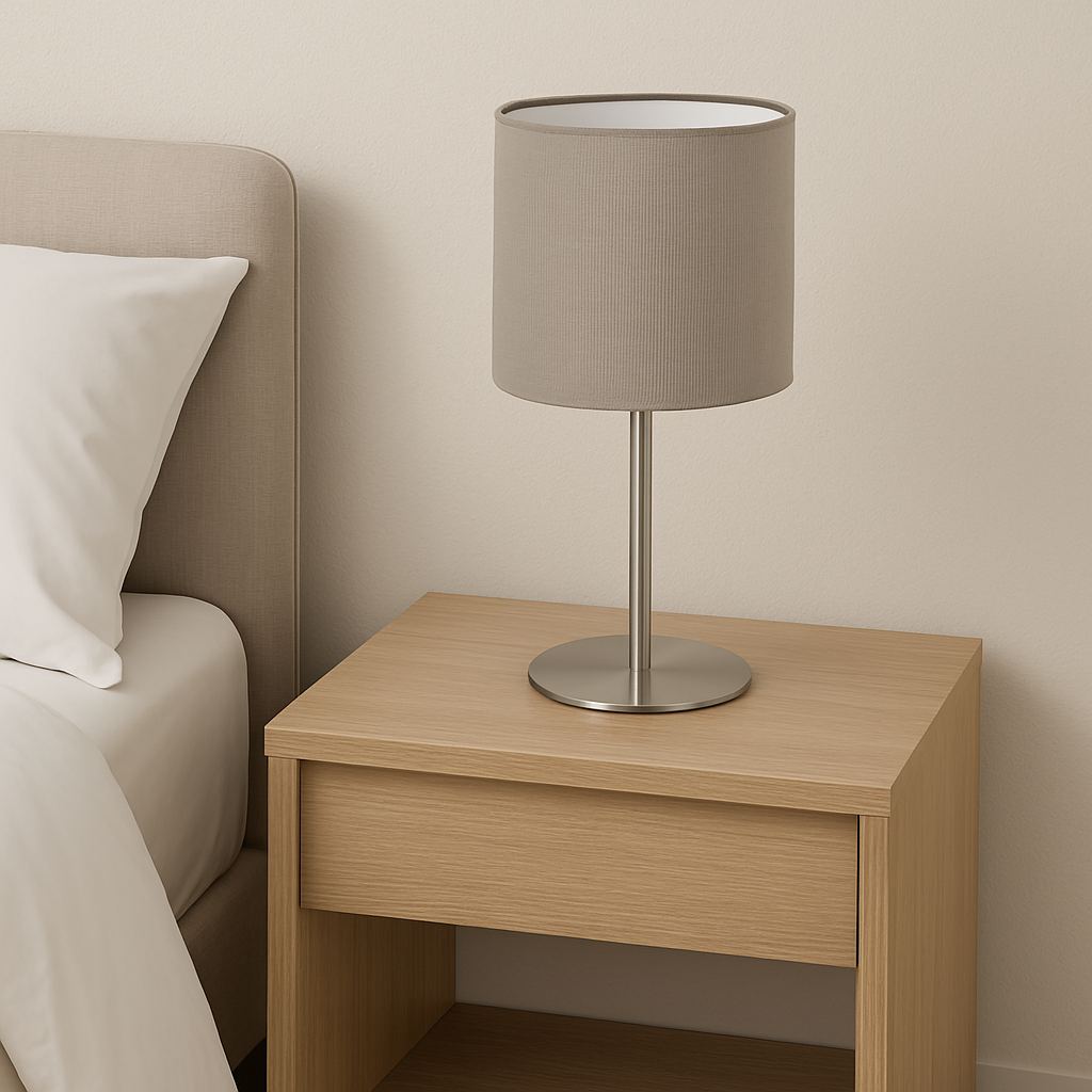 El portátil de mesa modelo PASTERI presenta un cuerpo de acero níquel combinado con una pantalla de tela en color gris pardo de 140 mm de diámetro. Diseñado para lámparas E14 de hasta 40W (no incluida), es compatible con bombillas incandescentes, de bajo consumo o LED, ofreciendo versatilidad en iluminación. Su altura de 275 mm y el interruptor integrado en el cable facilitan su uso y colocación en diversos espacios, aportando funcionalidad y un diseño sobrio y elegante para ambientes profesionales o residenciales.