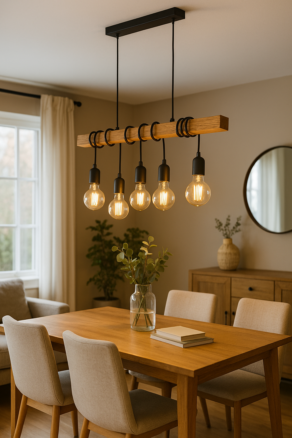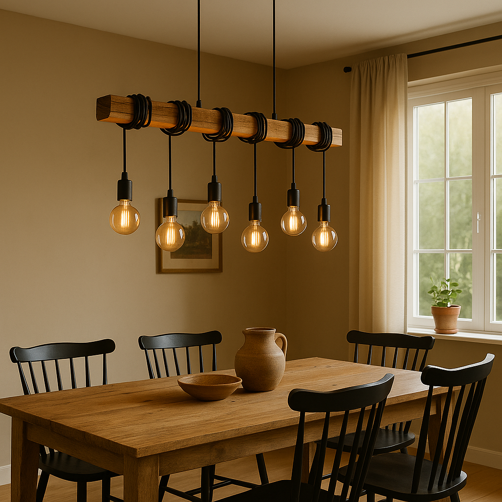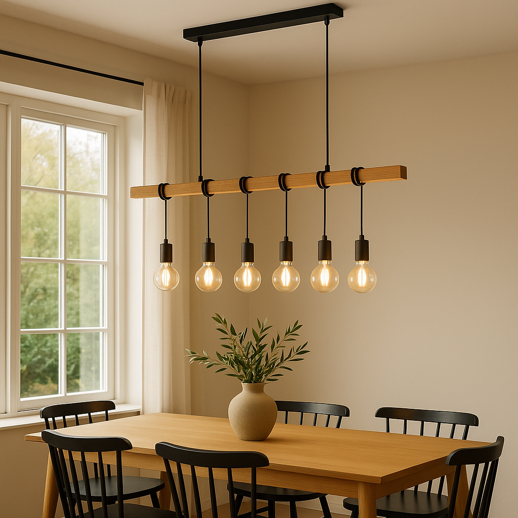 Colgante con estructura de madera y portalámparas vintage, 6xE27. Ideal para iluminar grandes espacios de manera eficiente, proporcionando un estilo rústico y elegante. Largo: 100cm, alto: 110cm. Lamparita no incluida.