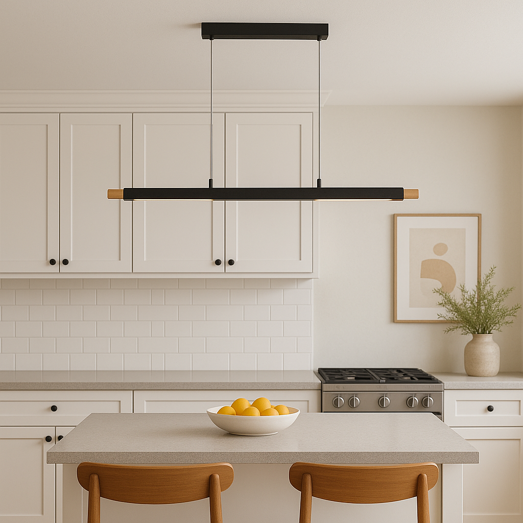 Colgante con estructura de acero y detalles de madera, 27W, 3000K y 3850LM. Este colgante combina eficiencia energética y estilo rústico-moderno, con opción de atenuación de luz para adaptarse a cualquier ambiente. Medidas: largo 1000 mm x ancho 165 mm x altura 1100 mm.