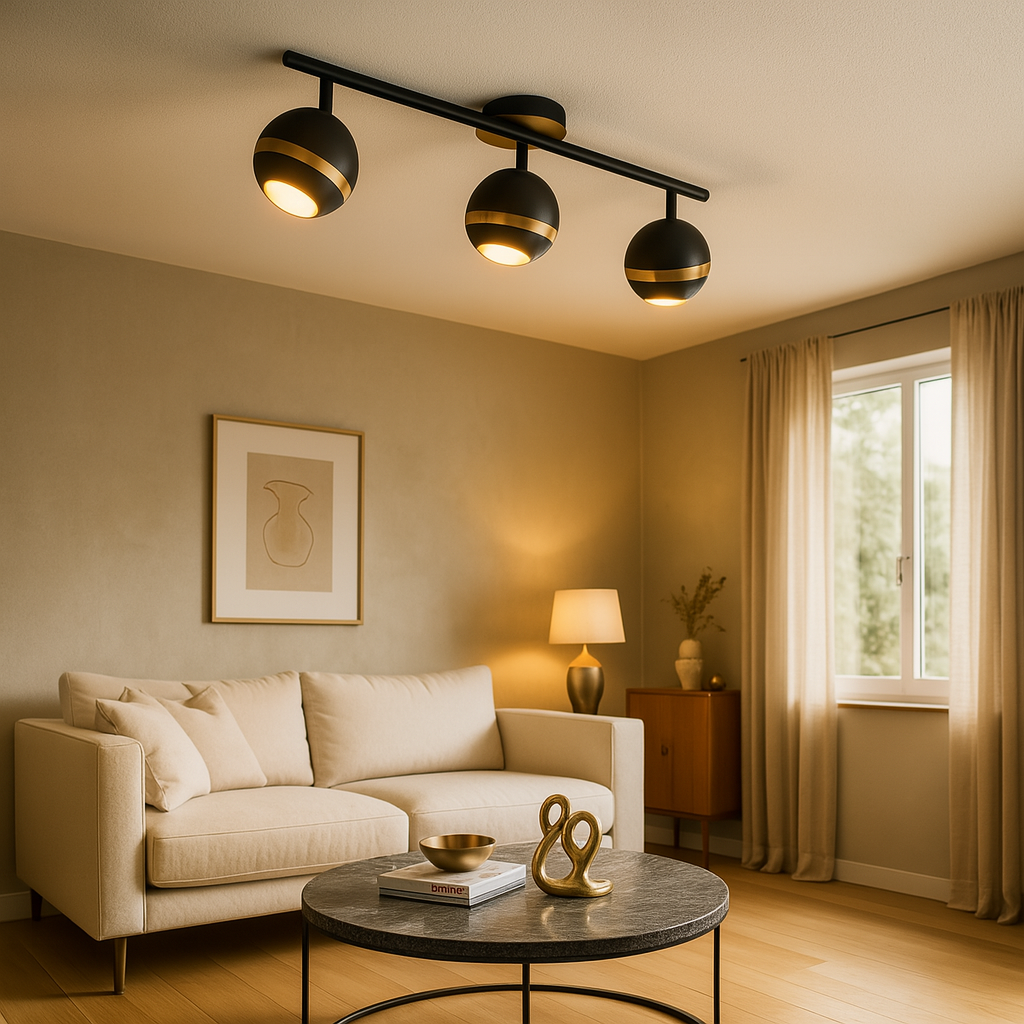Spot en acabado negro y dorado, con 3 bombillas GU10 incluidas, cada una de 3,3W y temperatura de color cálido 3000K. El modelo "Nocito" es ideal para agregar elegancia a espacios modernos, ofreciendo una iluminación eficiente y decorativa en salones, oficinas y más.