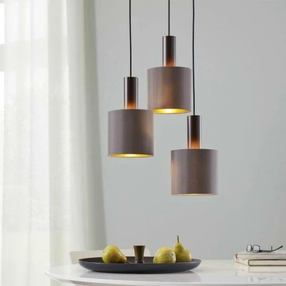 Colgante de tela marrón oscuro. Su diseño elegante y sobrio es ideal para proporcionar una luz cálida y acogedora, combinando perfectamente con cualquier estilo decorativo. Medidas: 1500x380mm (altura x diámetro). Lamparita no incluida.