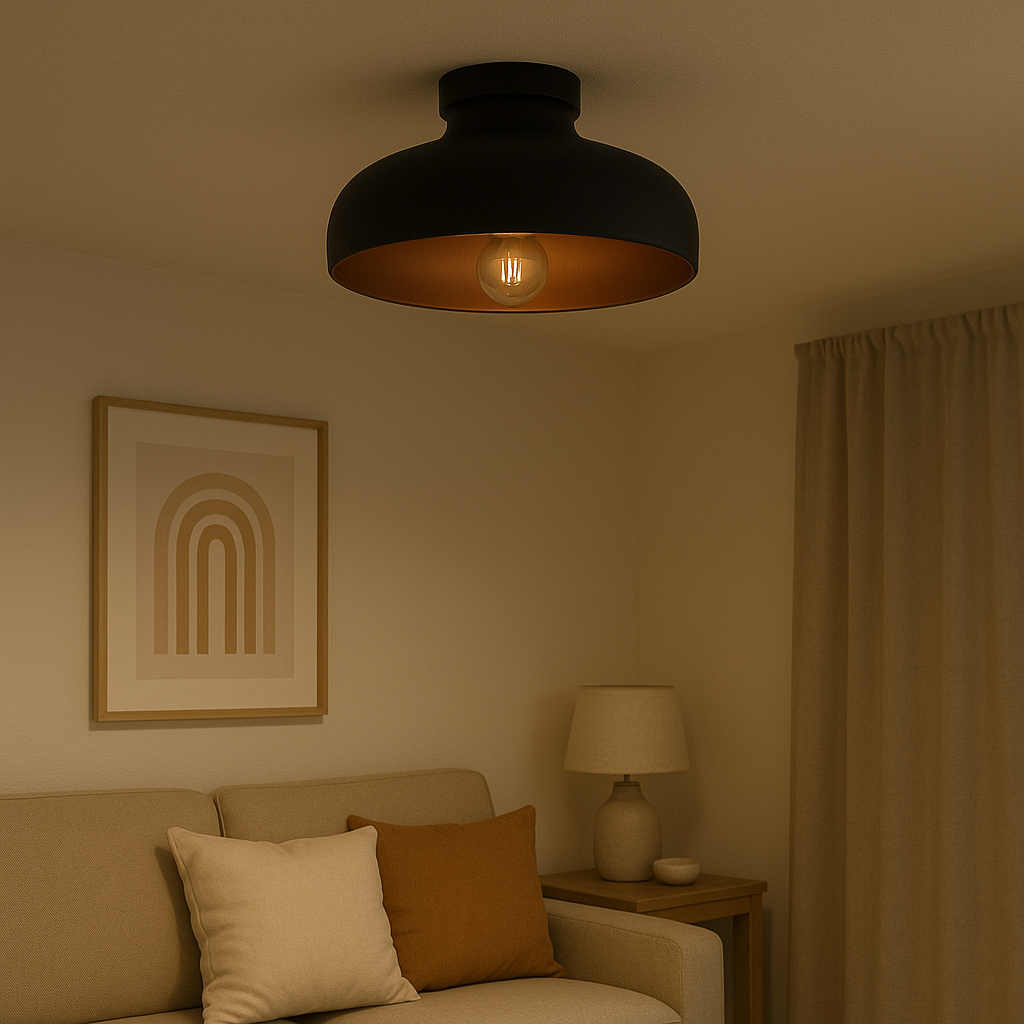 Aplique de techo con estructura de acero negro y detalles en cobre, 1 portalámparas E27 y un diámetro de 400mm. Perfecto para ambientes contemporáneos con un toque industrial y sofisticado.