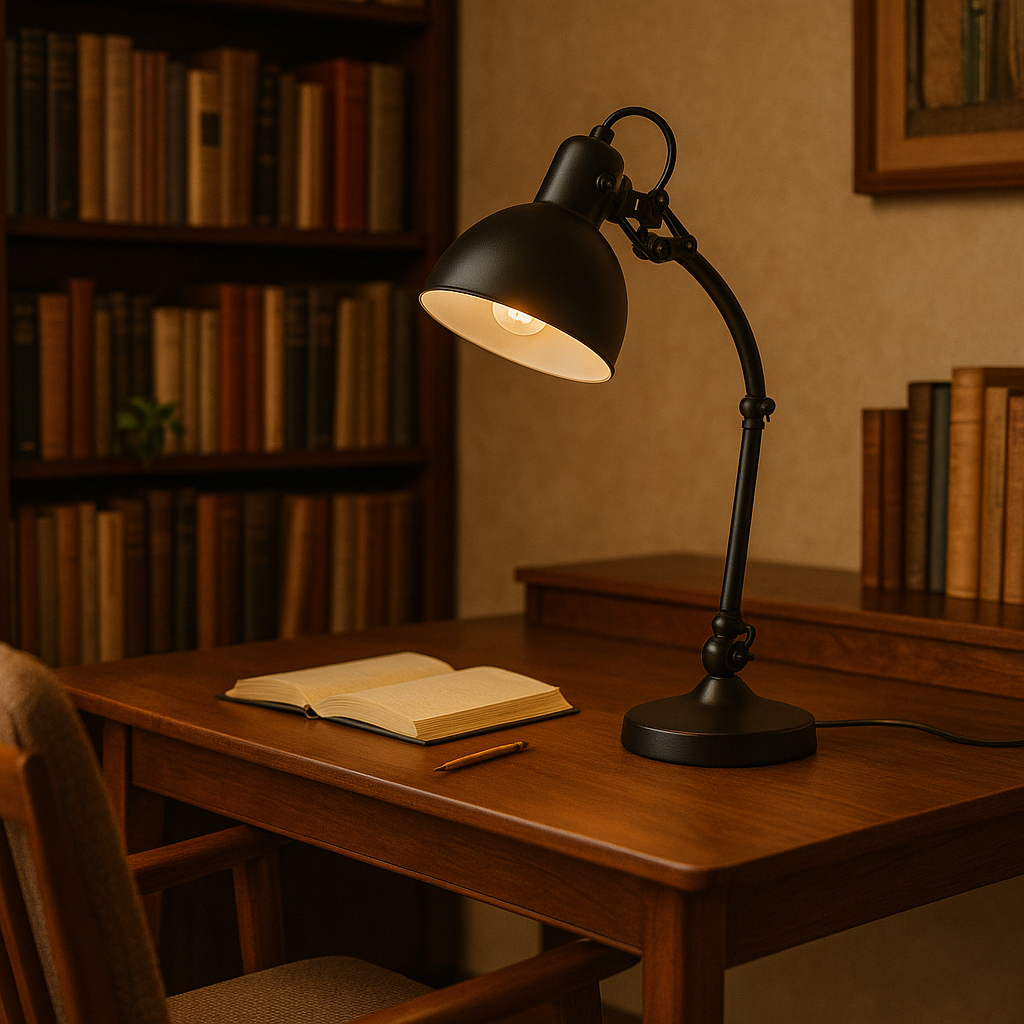 Diseño industrial con base de acero negro y detalles en madera, esta lámpara de mesa es perfecta para añadir un toque de elegancia moderna.