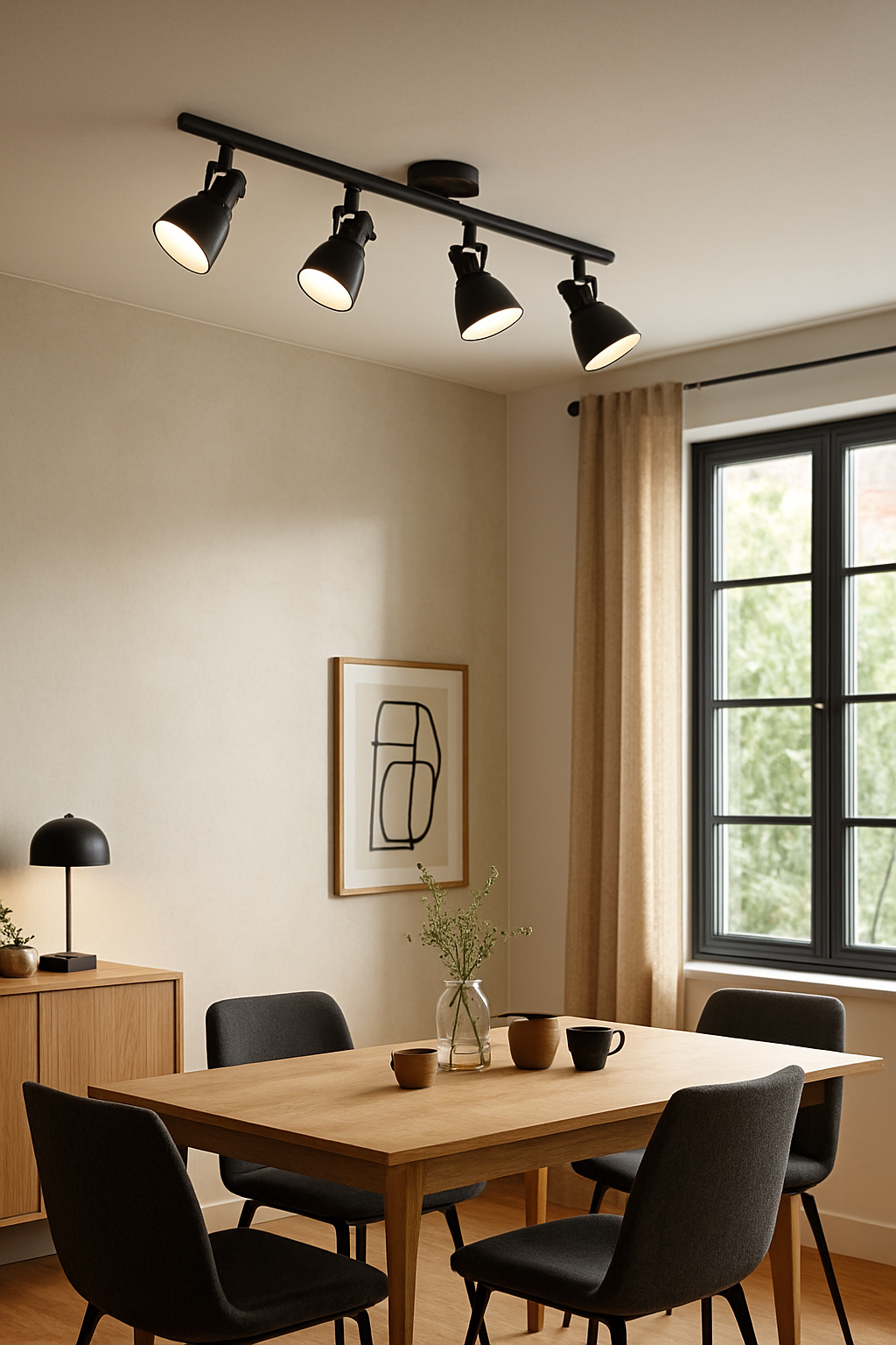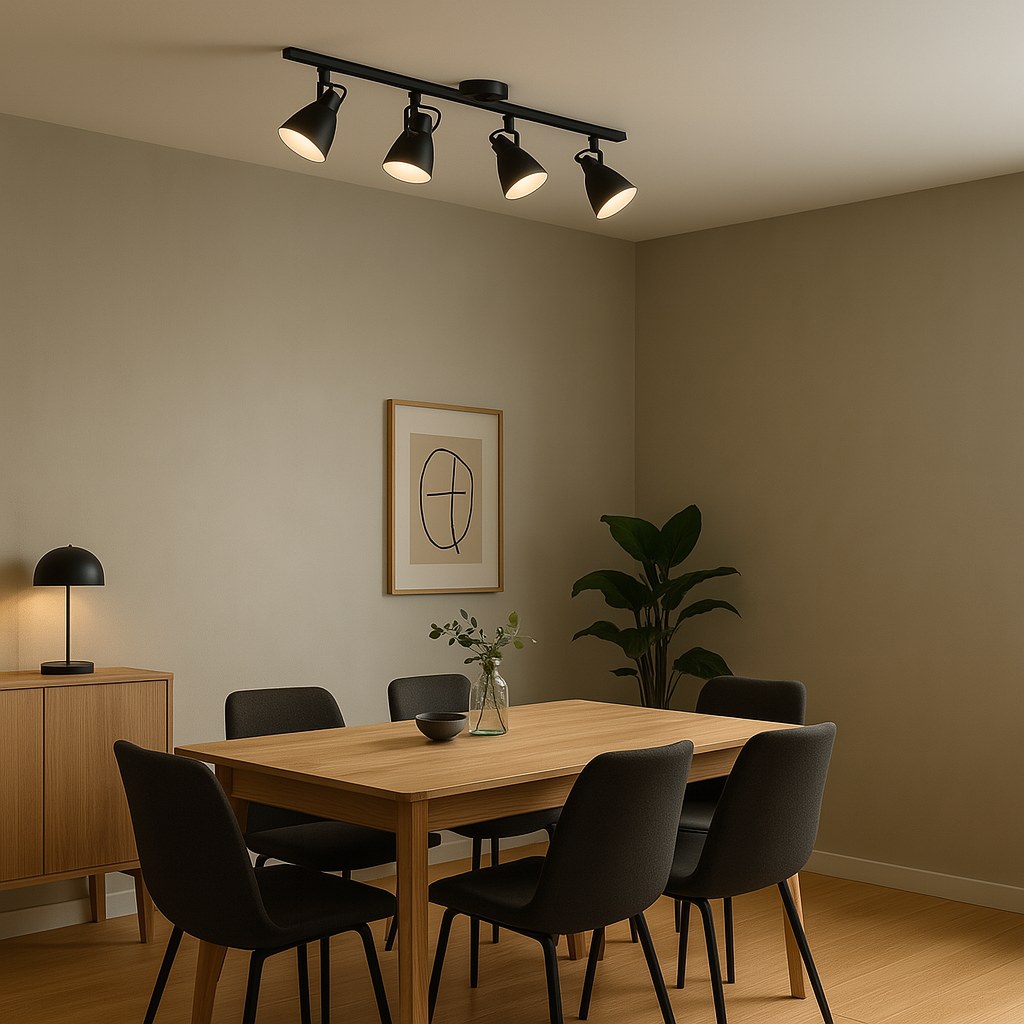 Spot tipo varal en acero negro con 4 lámparas GU10 (no incluidas). Su diseño de varal ofrece un estilo contemporáneo y versátil, ideal para iluminar grandes espacios o distribuir la luz de manera uniforme en diferentes áreas. Perfecto para interiores modernos y funcionales.