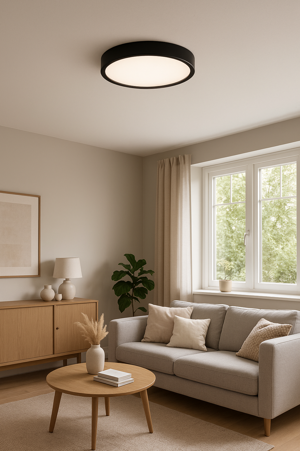 Plafón LED redondo con acabado negro, 16,8W de potencia, 2000LM de luminosidad y un diámetro de 340mm. Ideal para iluminar amplios espacios con una luz eficiente y un diseño contemporáneo.