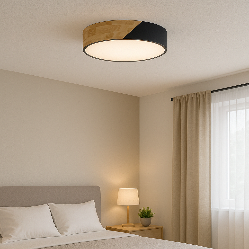 Plafón redondo con pantalla de tela negra y detalles de madera, 2 portalámparas E27. Este plafón es perfecto para ambientes con un estilo moderno y natural, proporcionando una luz suave y acogedora.