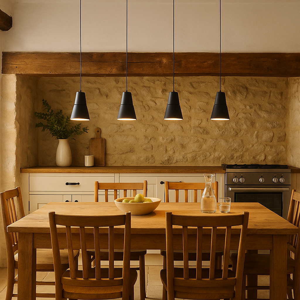Colgante de estilo industrial con forma de cono, estructura metálica negra y 4 portalámparas E27. Ideal para proporcionar una luz intensa y moderna, perfecta para dar un toque de estilo único a cualquier espacio. Medidas: 975x150x1100mm. Lamparita no incluida.