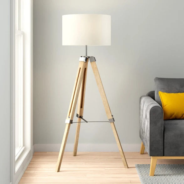 Portátil de pie con base de madera en forma de trípode y pantalla beige, 1 portalámparas E27. Su diseño cómodo y contemporáneo es perfecto para darle un toque elegante a tu espacio. Medidas: altura 1500 mm, diámetro 700 mm.