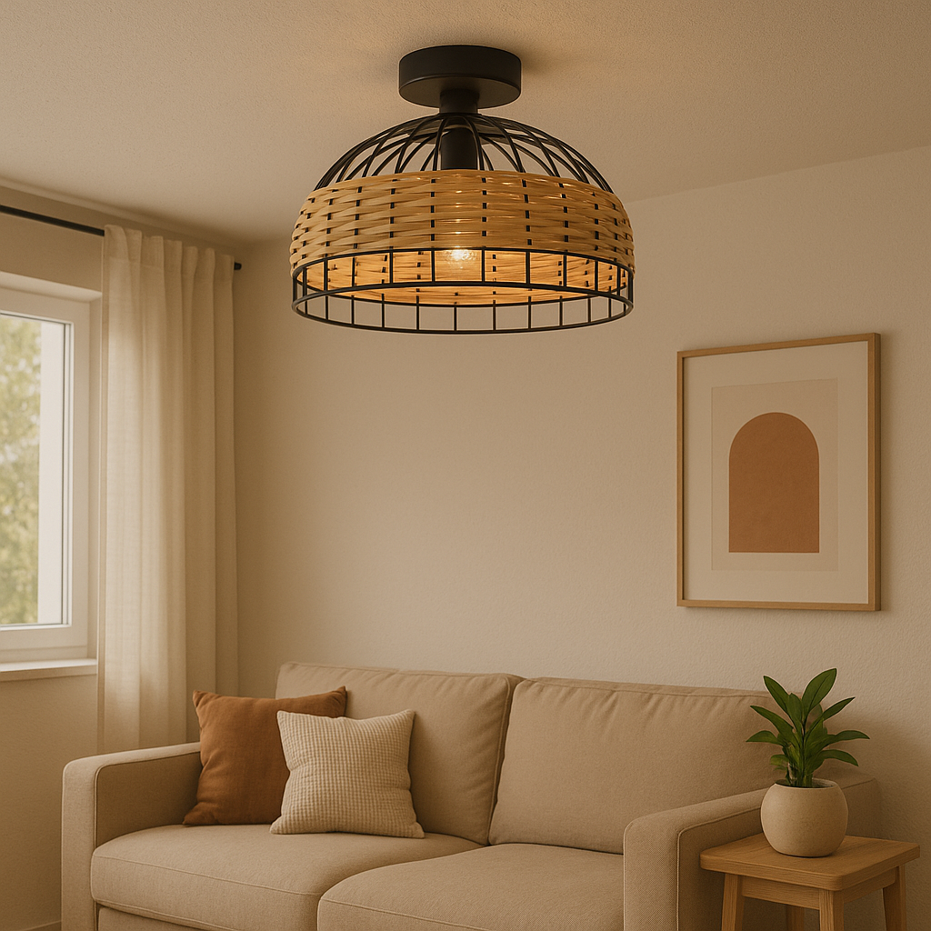 Aplique de techo de estilo vintage con estructura de acero negro y detalles de ratán, 1 portalámparas E27. Perfecto para crear un ambiente acogedor y elegante en espacios con toques de estilo clásico.
