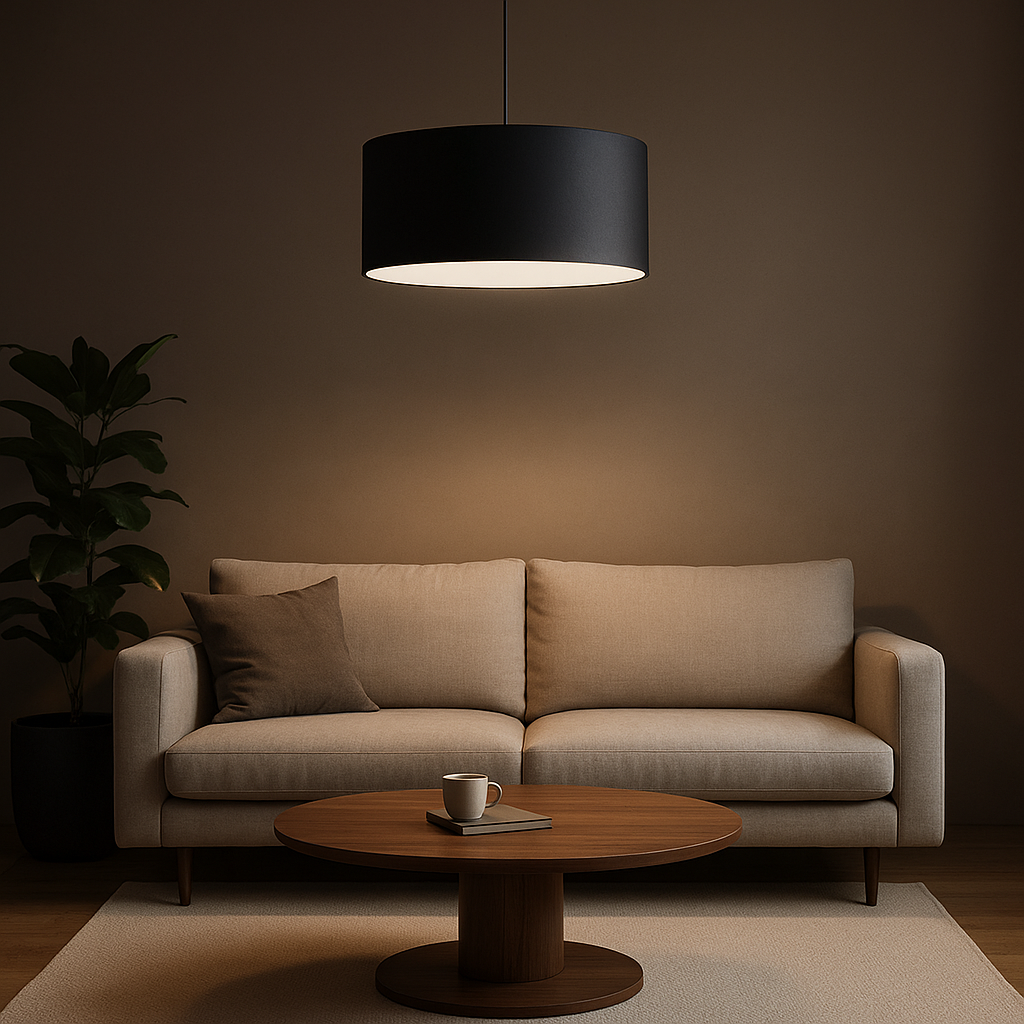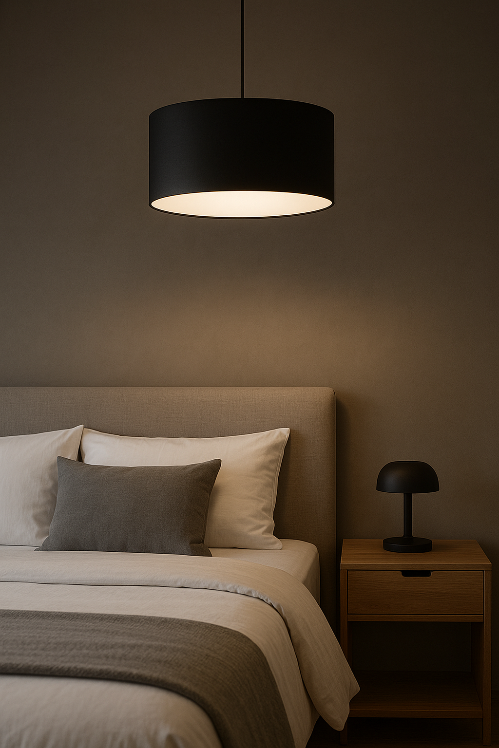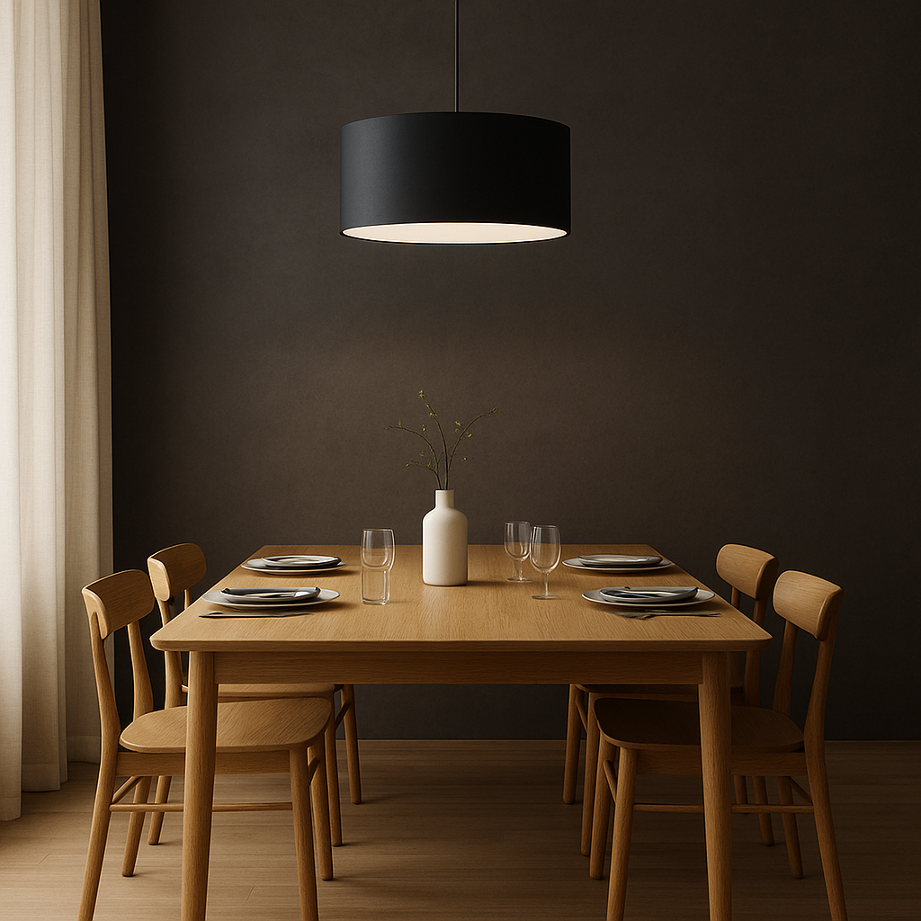 Colgante con estructura de acero y pantalla textil negra, 1 portalámparas E27. Ideal para iluminar espacios de forma elegante y sofisticada, proporcionando una luz suave y acogedora. Medidas: Ø380x1100mm (DiámetroxAltura). Lamparita no incluida.