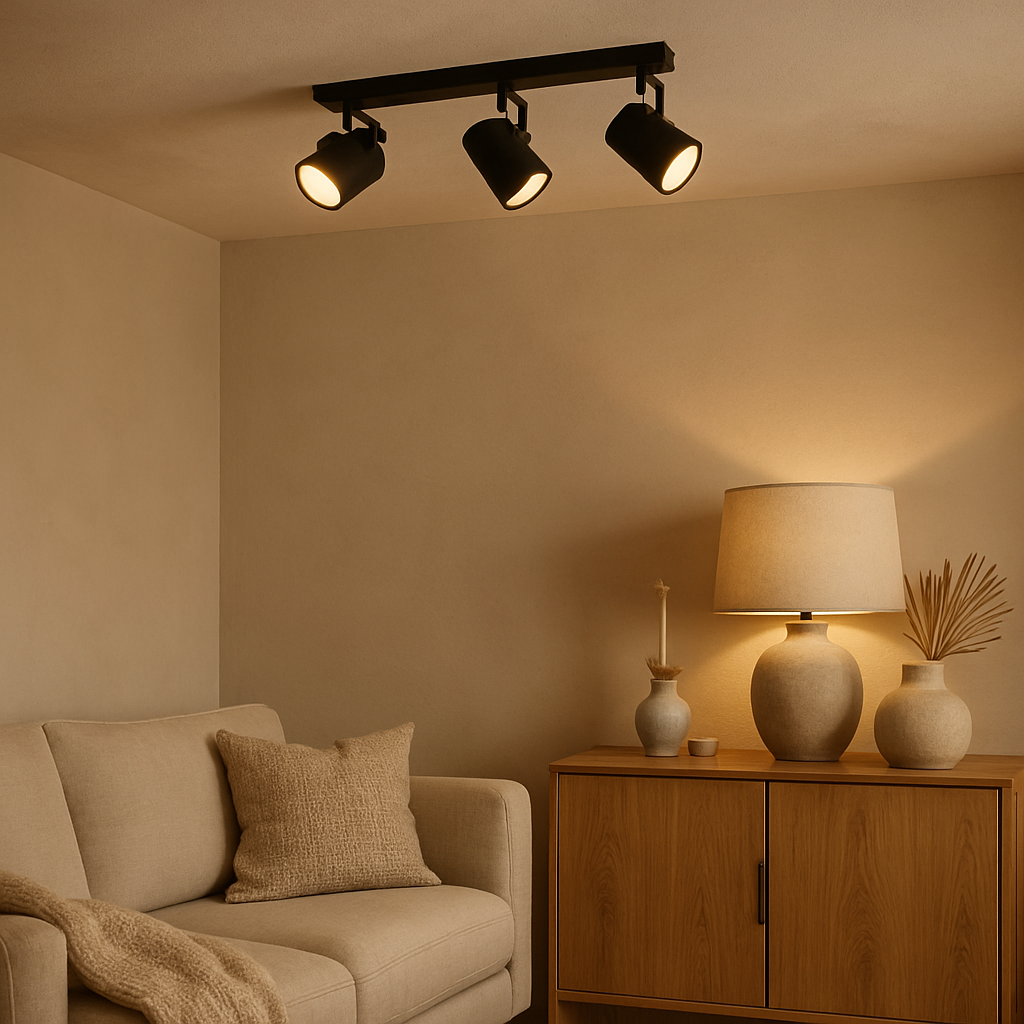 Aplique de pared o techo con base rectangular en acero negro y 3 bases E27. Su diseño minimalista y elegante es perfecto para iluminar cualquier habitación, ofreciendo una luz funcional y atractiva.