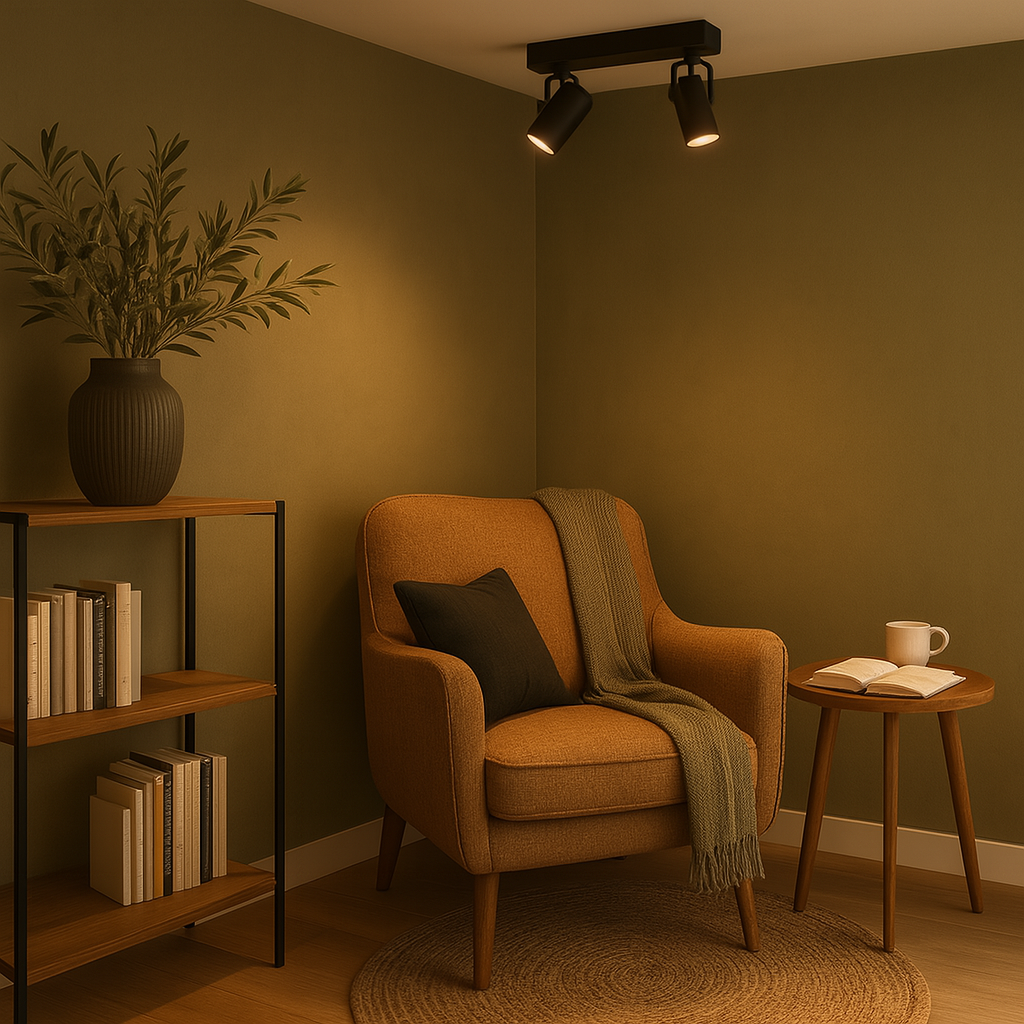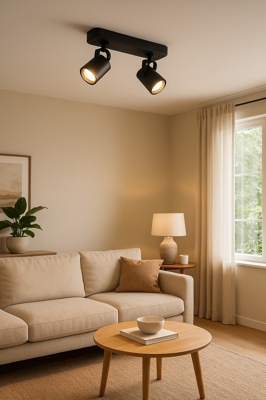 Aplique/spot de acero negro con capacidad para 2 bombillas GU10 (no incluidas). Perfecto para iluminación focalizada en interiores, proporcionando un diseño moderno y elegante. Ideal para oficinas, salas de estar o cualquier espacio donde se requiera una iluminación precisa.