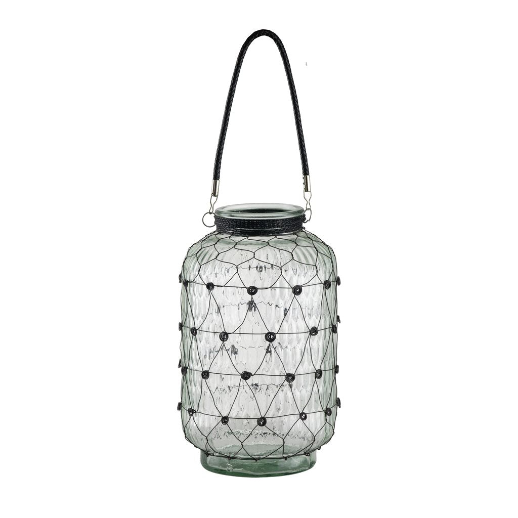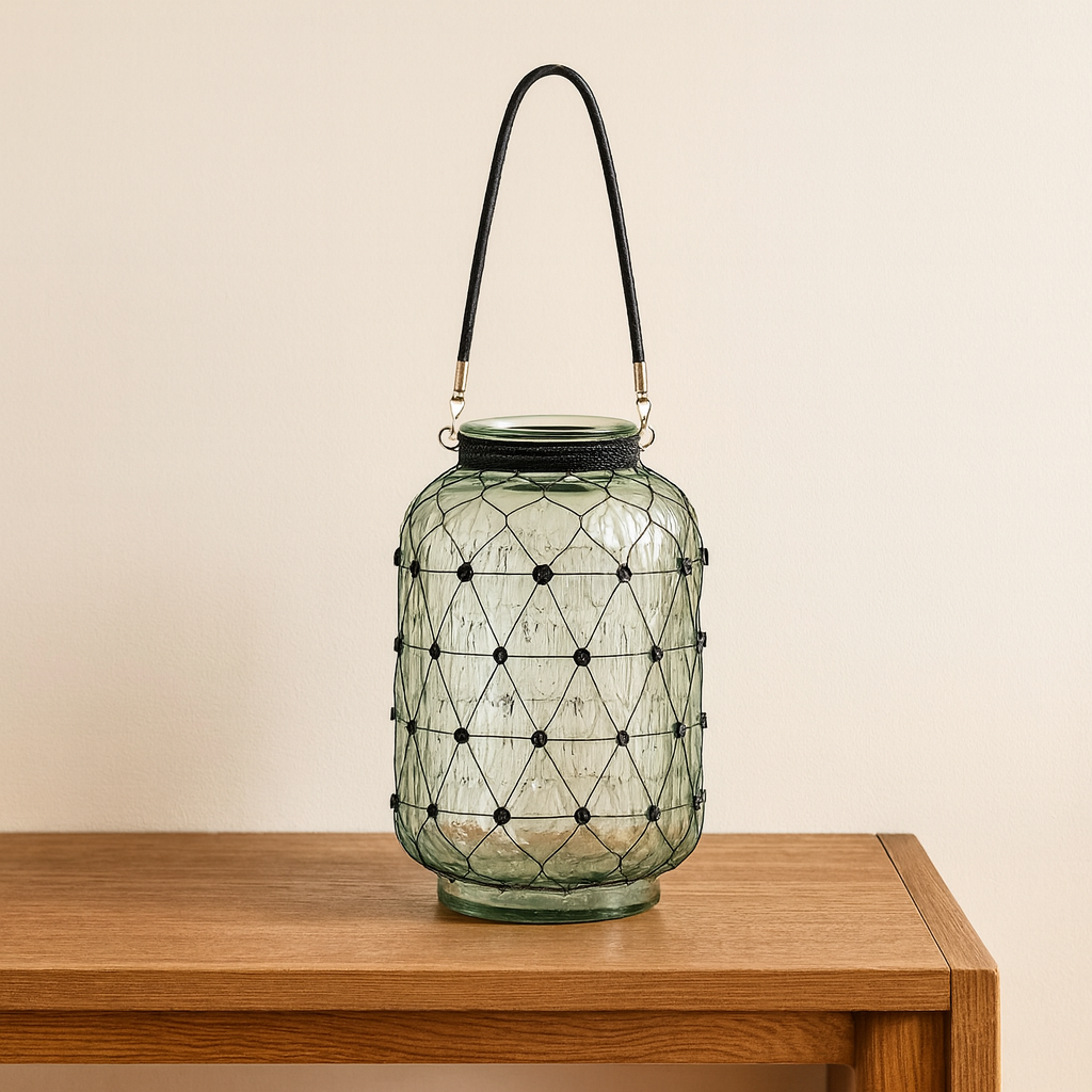 La jarra/florero de vidrio con malla negra aporta textura artesanal y un aire vintage a cualquier ambiente. La pieza en vidrio verdoso está envuelta en una red metálica con nudos y apliques negros, y suma un asa de cuero sintético con herrajes metálicos para moverla o colgarla. Podés usarla como florero de boca ancha (tallos, pampas, flores secas) o como farol decorativo con vela LED o guirnalda de micro-luces. Las sutiles irregularidades del vidrio realzan su carácter único y la convierten en un acento perfecto para consolas, mesas auxiliares o estanterías. Dale un toque exclusivo a tu hogar con nuestro florero c/red. Pensada para quienes buscan estilo único en cada detalle. Medidas aproximadas: 22x22x.