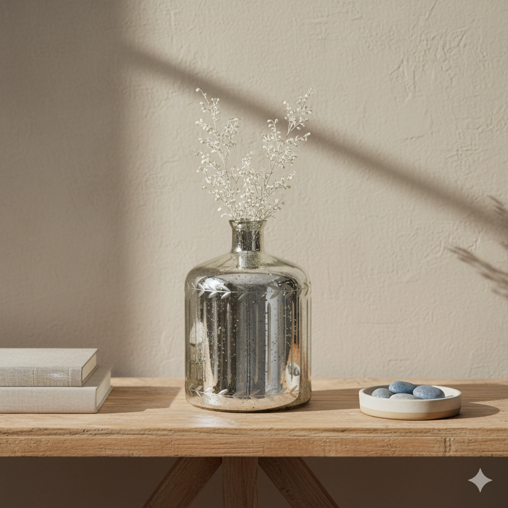 Añade brillo y modernidad a tu hogar con este Florero de Vidrio. Su acabado plateado estilo mercurio y detalles grabados aportan un toque vanguardista y una durabilidad excepcional. Perfecto para realzar tus arreglos florales o como pieza decorativa única.