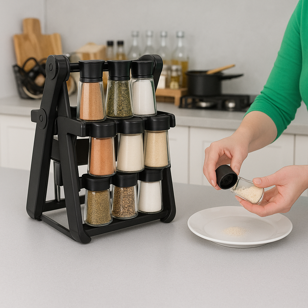 Dale un toque profesional a tu cocina con este especiero giratorio de diseño moderno. Incluye 18 frascos de vidrio con tapa metálica para que tengas todas tus especias organizadas, siempre a mano y con estilo. Su base giratoria permite un acceso rápido y cómodo desde cualquier ángulo.